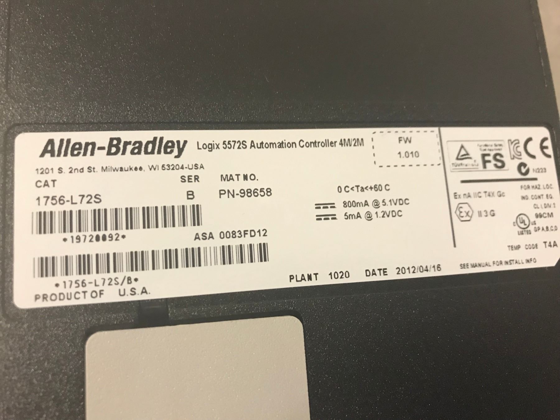(2) ALLEN BRADLEY 1756-L72S LOGIX 5572S AUTOMATION CONTROLLER 4M/2M
