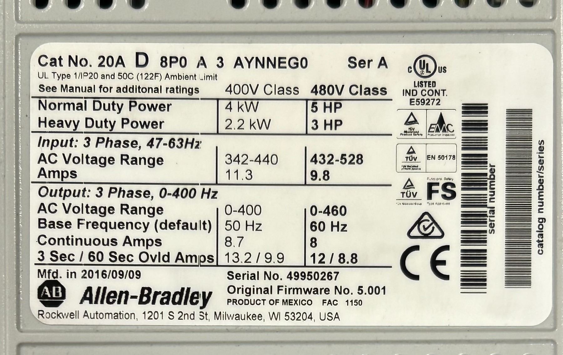 (2) Allen-Bradley #20A D 8P0 A 3 AYNNEG0 PowerFlex70 Drives