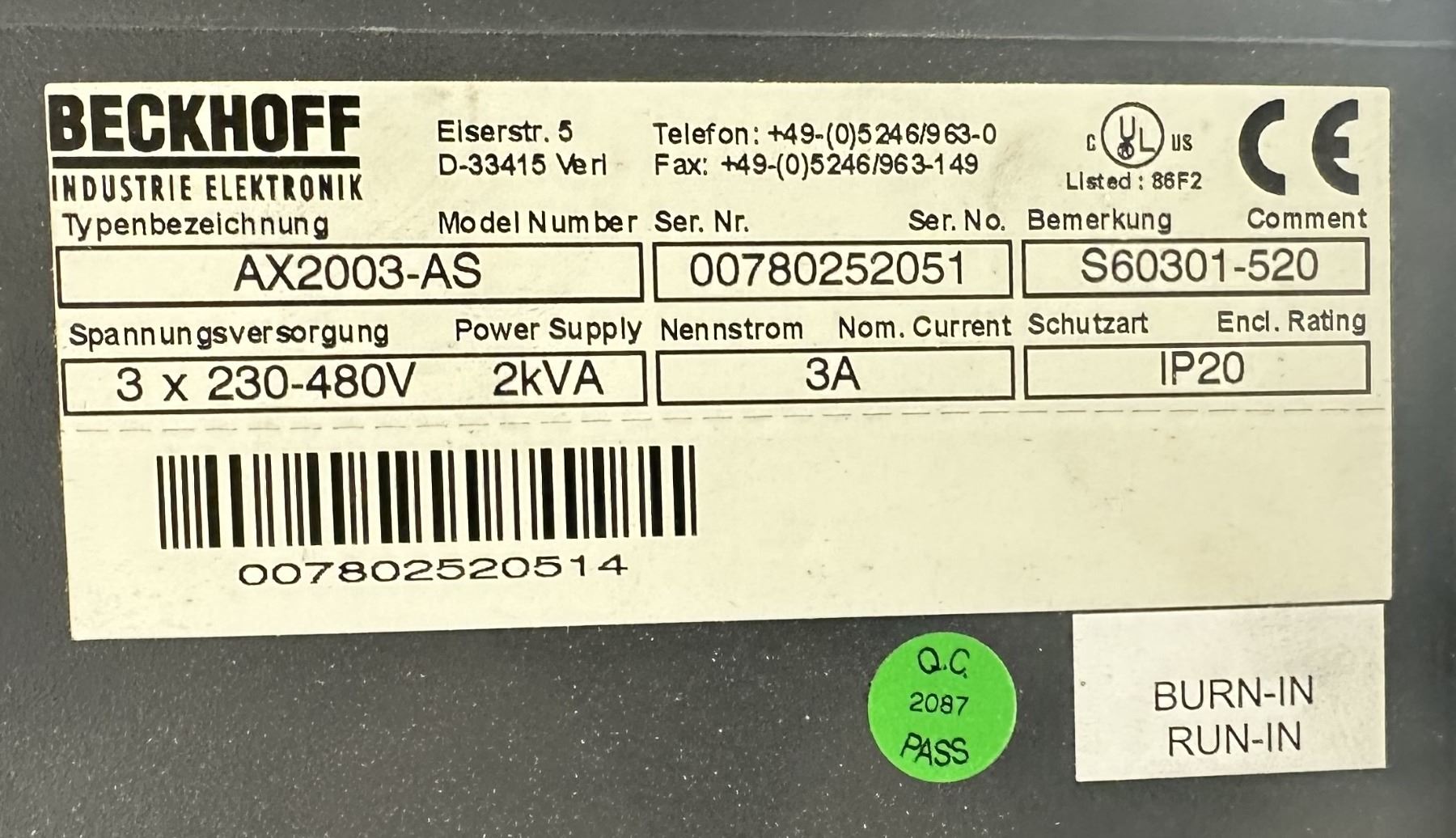 (2) Beckhoff #AX2003-AS / S60301-520 Digital Compact Servo Drive Amplifiers