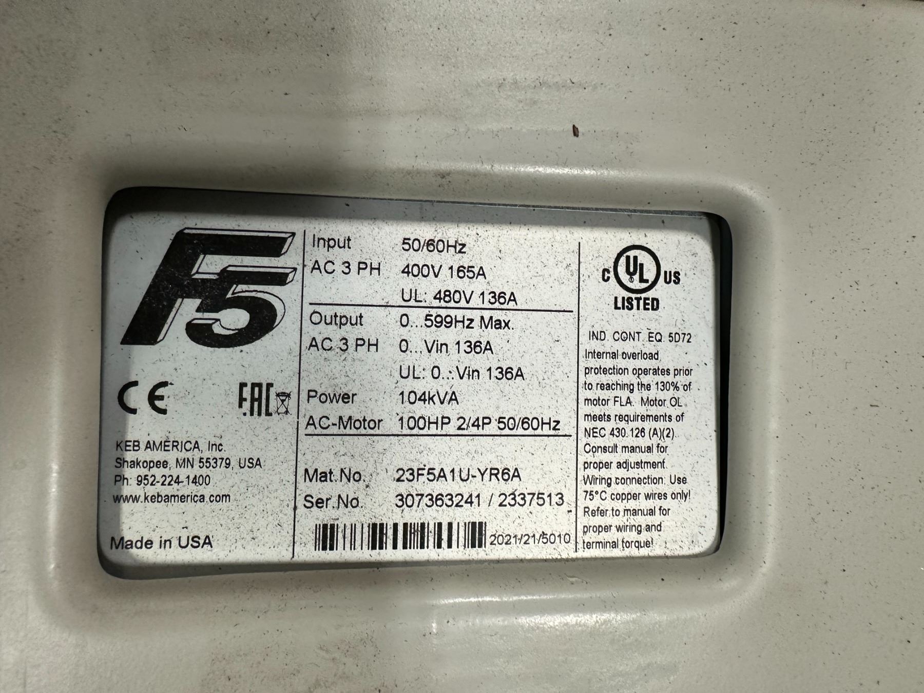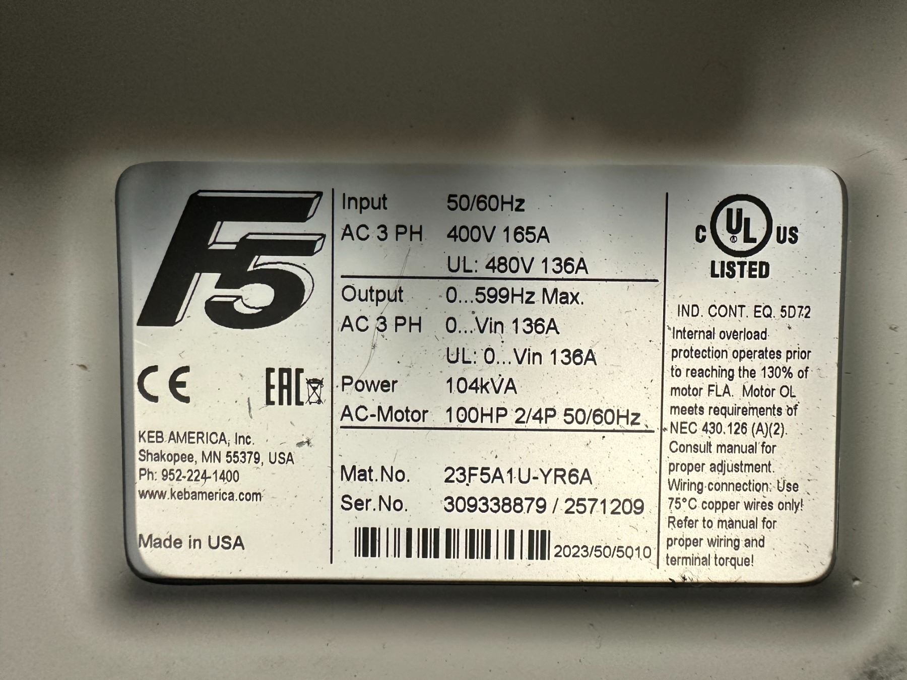 (2) Keb #23F5A1U-YR6A Haitian Injection Molding Inverters