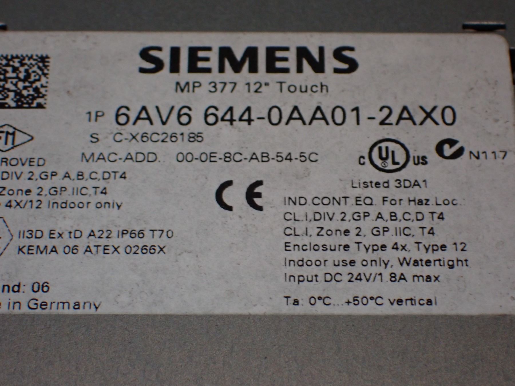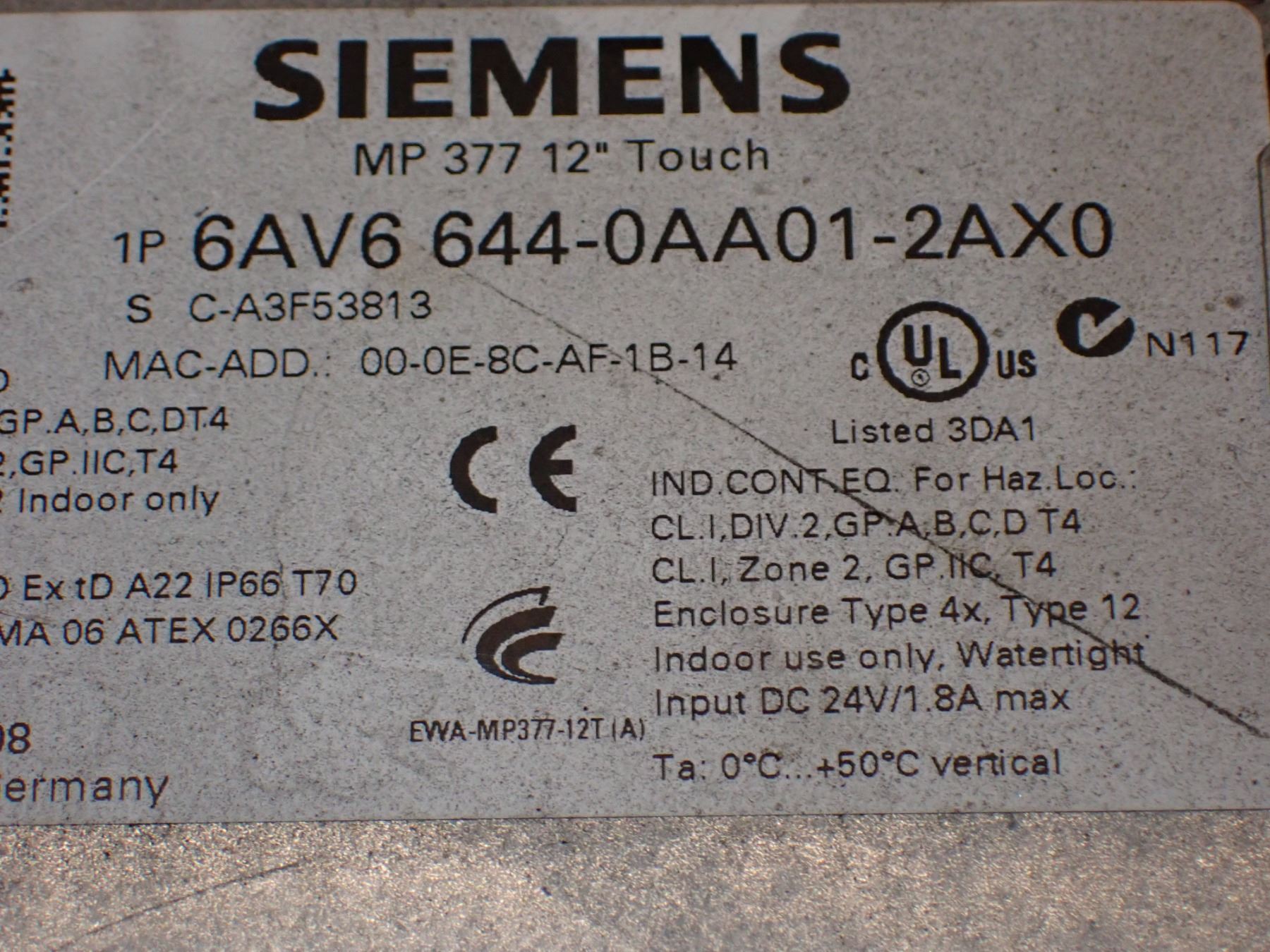 (2) Siemens # 1P 6AV6 644-0AA01-2AX0 MP 377 12" Touch Screens