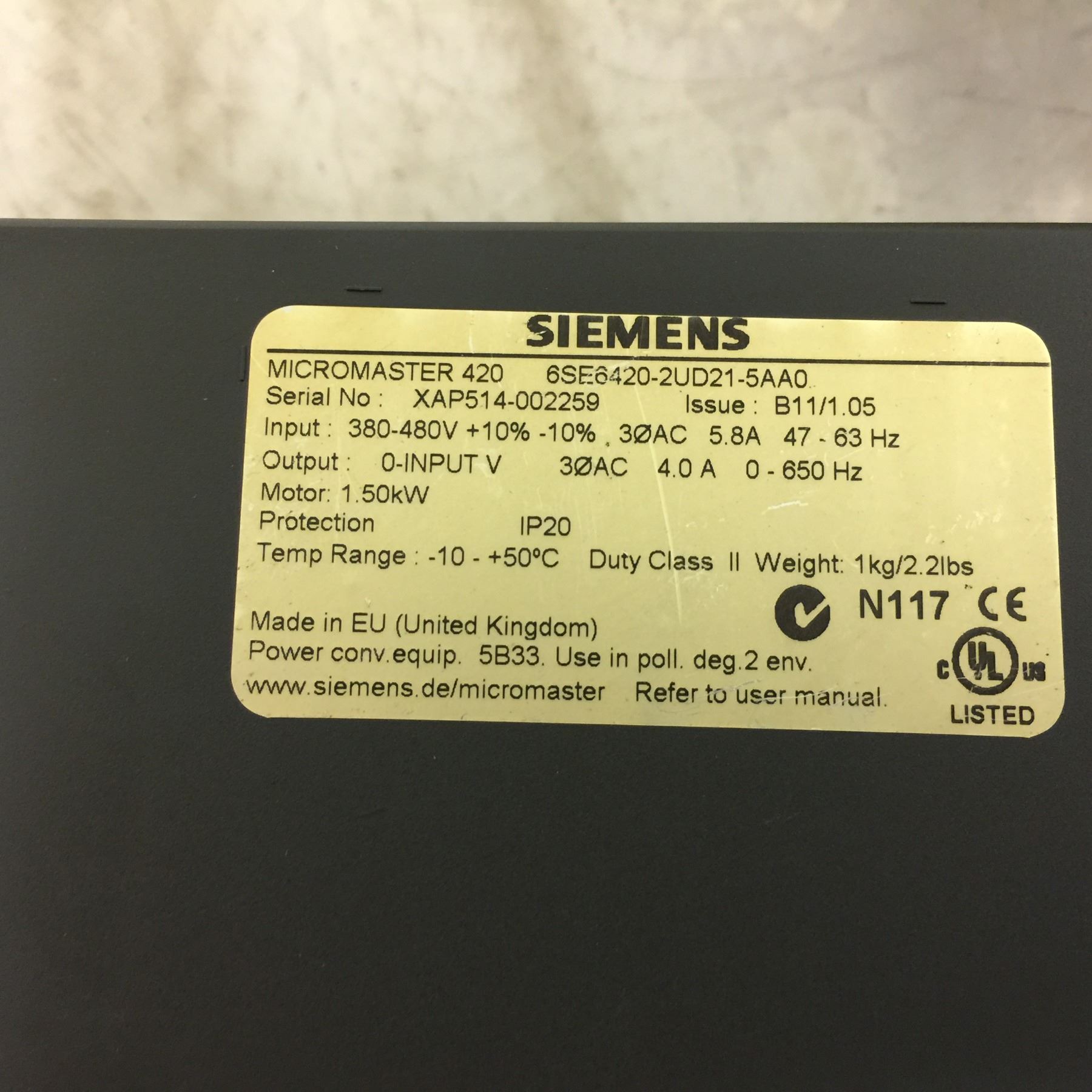 (2) Siemens 6SE6420-2UD21-5AA0 Micromaster 420 Drive