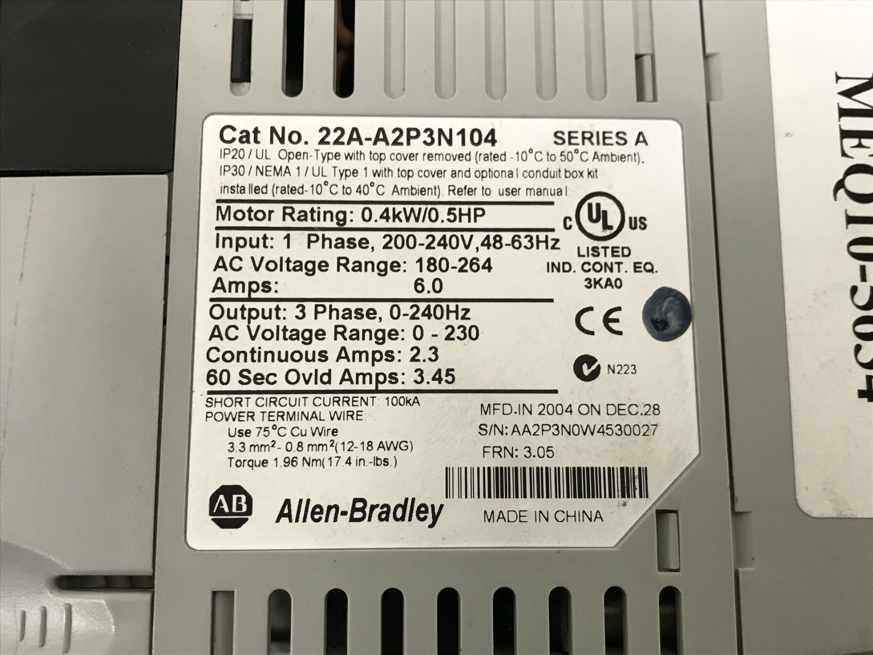 (3) ALLEN BRADLEY 22A-A2P3N104 POWER FLEX AC DRIVE