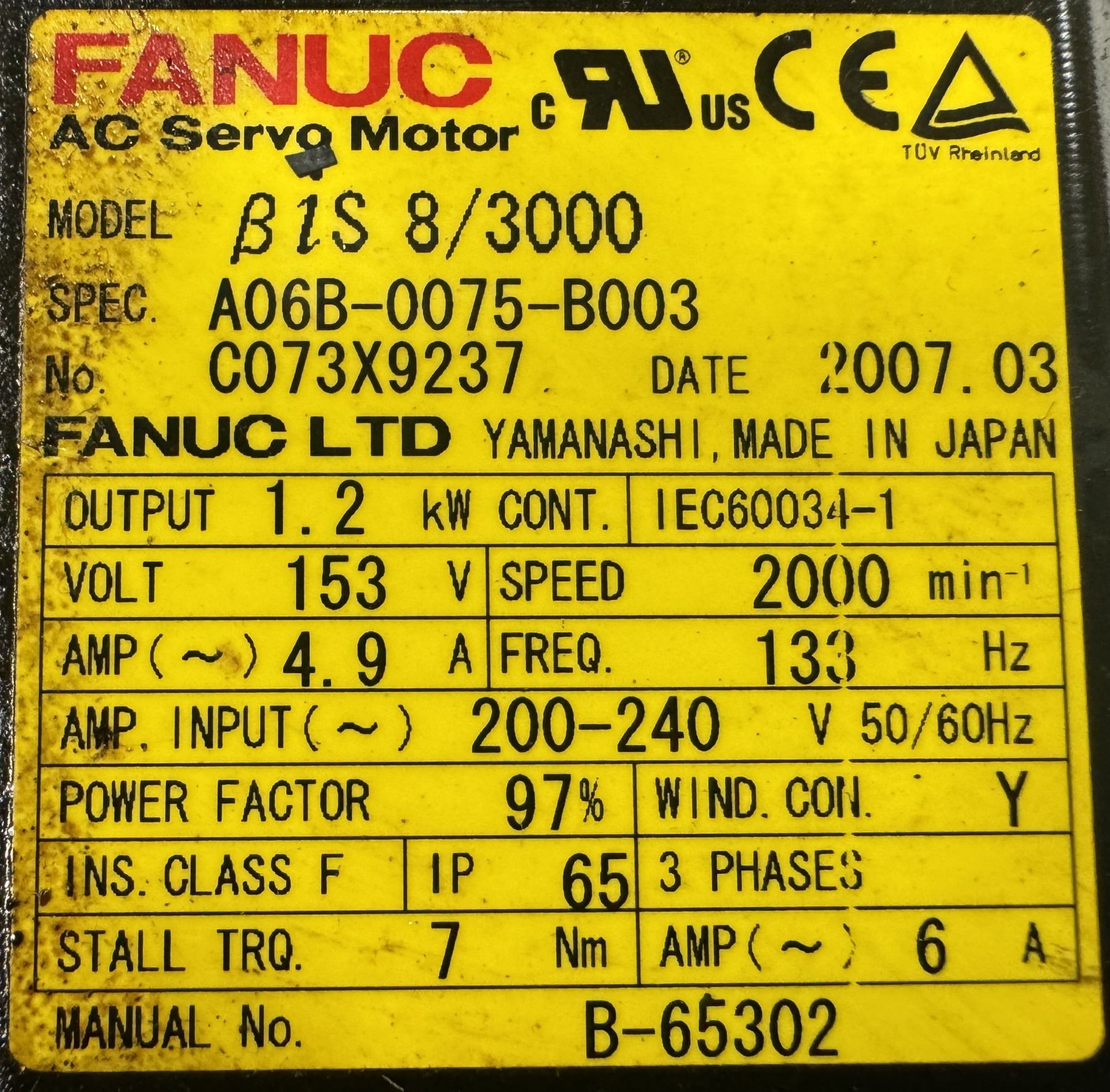 (3) Fanuc #A06B-0075-B003 #Bis 8/3000 AC Servo Motors