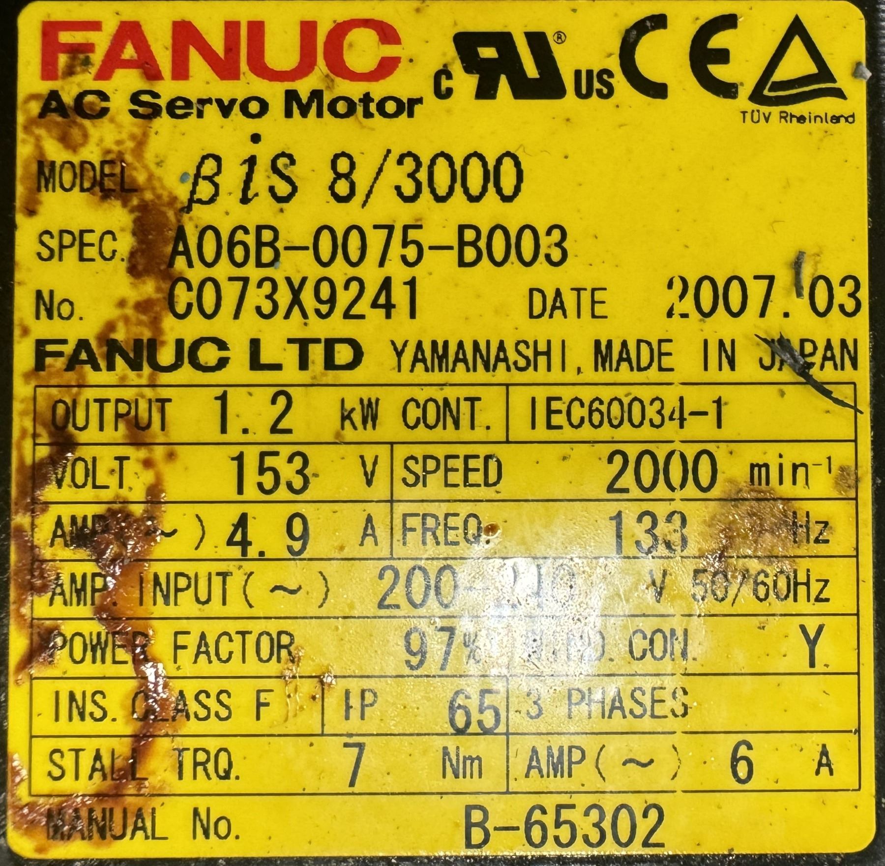 (3) Fanuc #A06B-0075-B003 #Bis 8/3000 AC Servo Motors