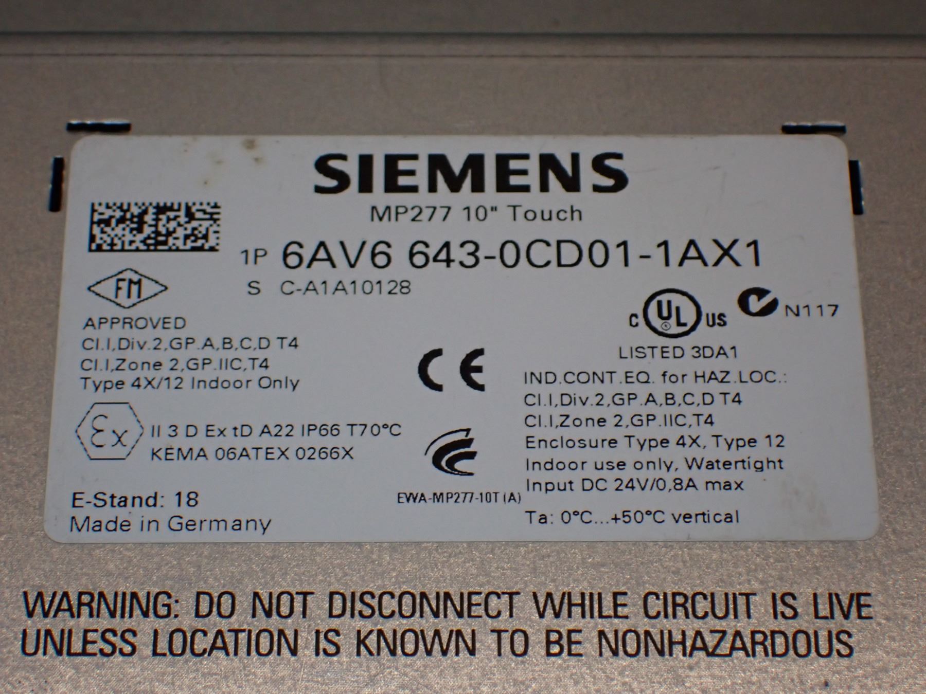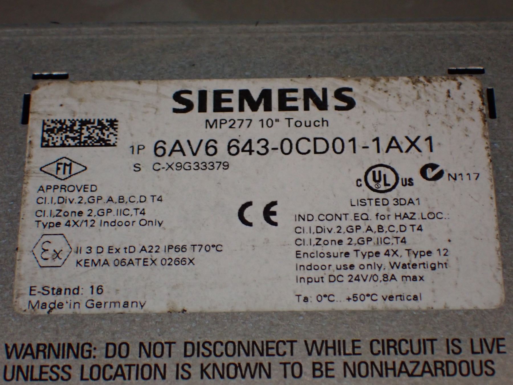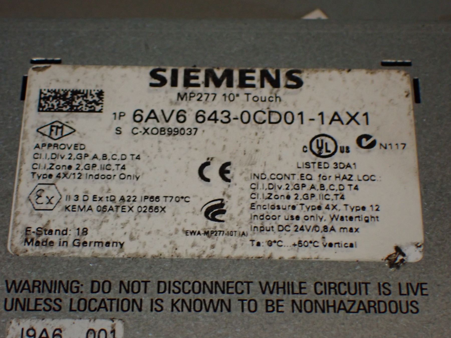 (3) Siemens # 1P 6AV6 643 - 0CD01 - 1AX1 MP277 10" Touch Screens
