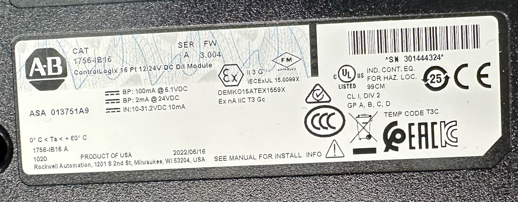 (4) Allen Bradley #1756-IB16 Control Logix 16 Pt 12/24V DC D/I Modules