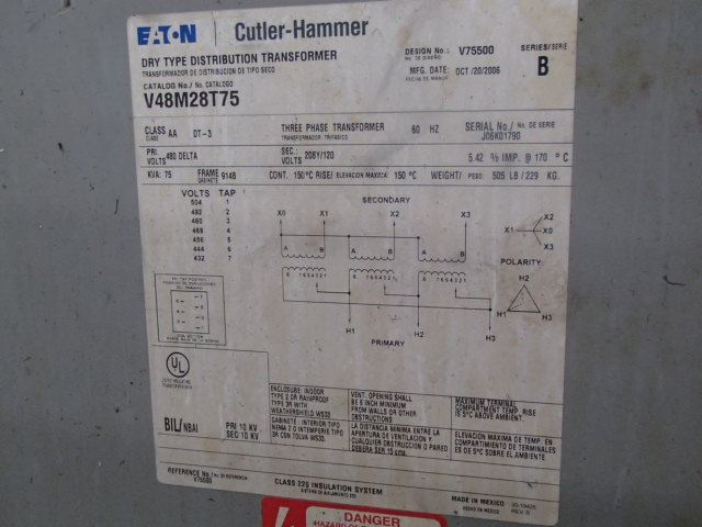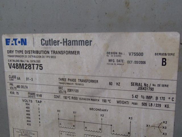 75 KVA Cutler-Hammer Dry Type Transformer, M/N- V48M28T75, Series- B