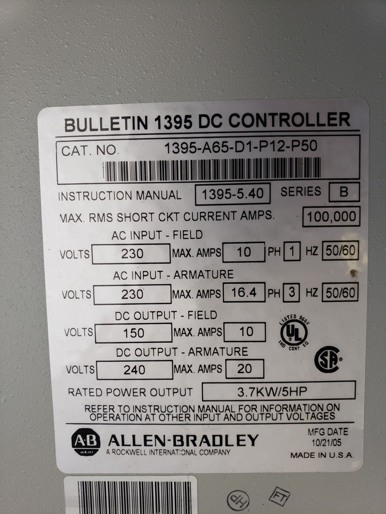 ALLEN-BRADLEY 1395-A65-D1-P12-P50 BULLETIN 1395 DC CONTROLLER