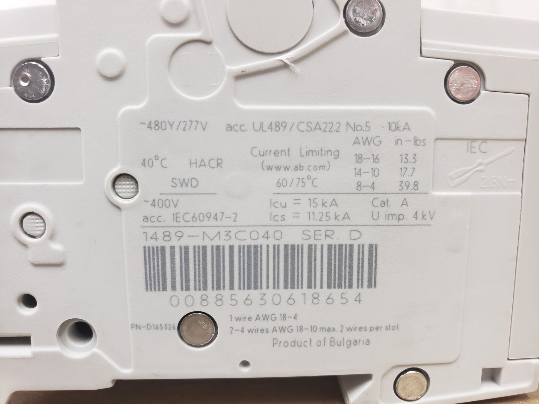 ALLEN-BRADLEY 1489-M3C040 SER D CIRCUIT BREAKER