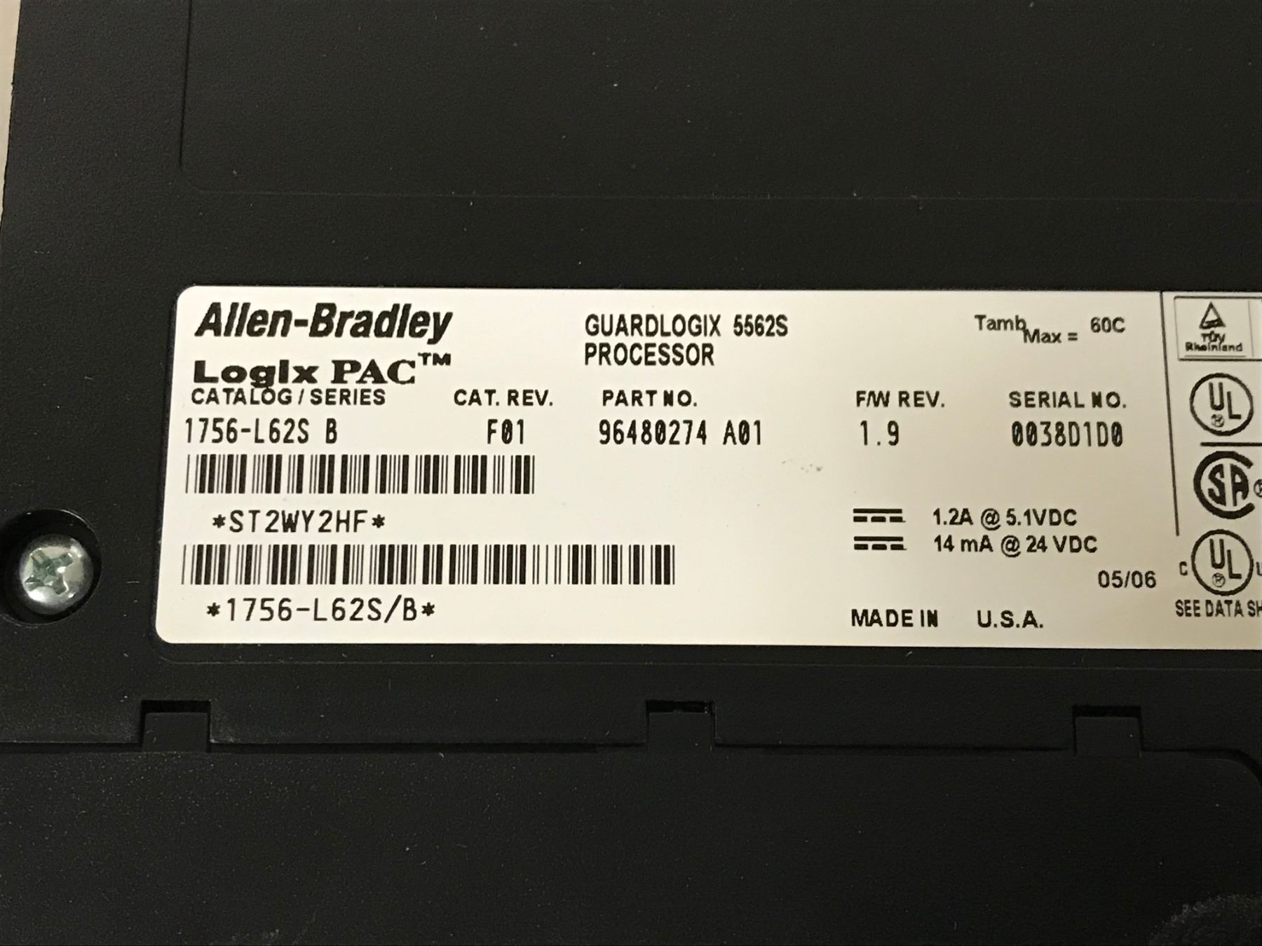 ALLEN BRADLEY 1756-L62S B GUARD LOGIX 5562S PROCESSOR