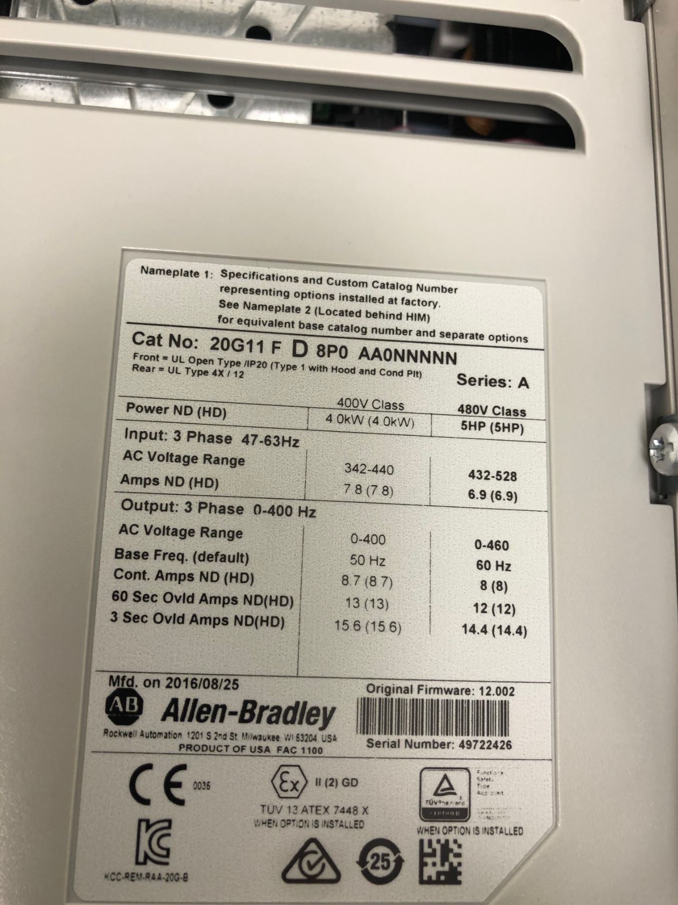 ALLEN-BRADLEY 20G11 F D 8P0 AA0NNNNN_SERIES A_POWERFLEX 755 DRIVE