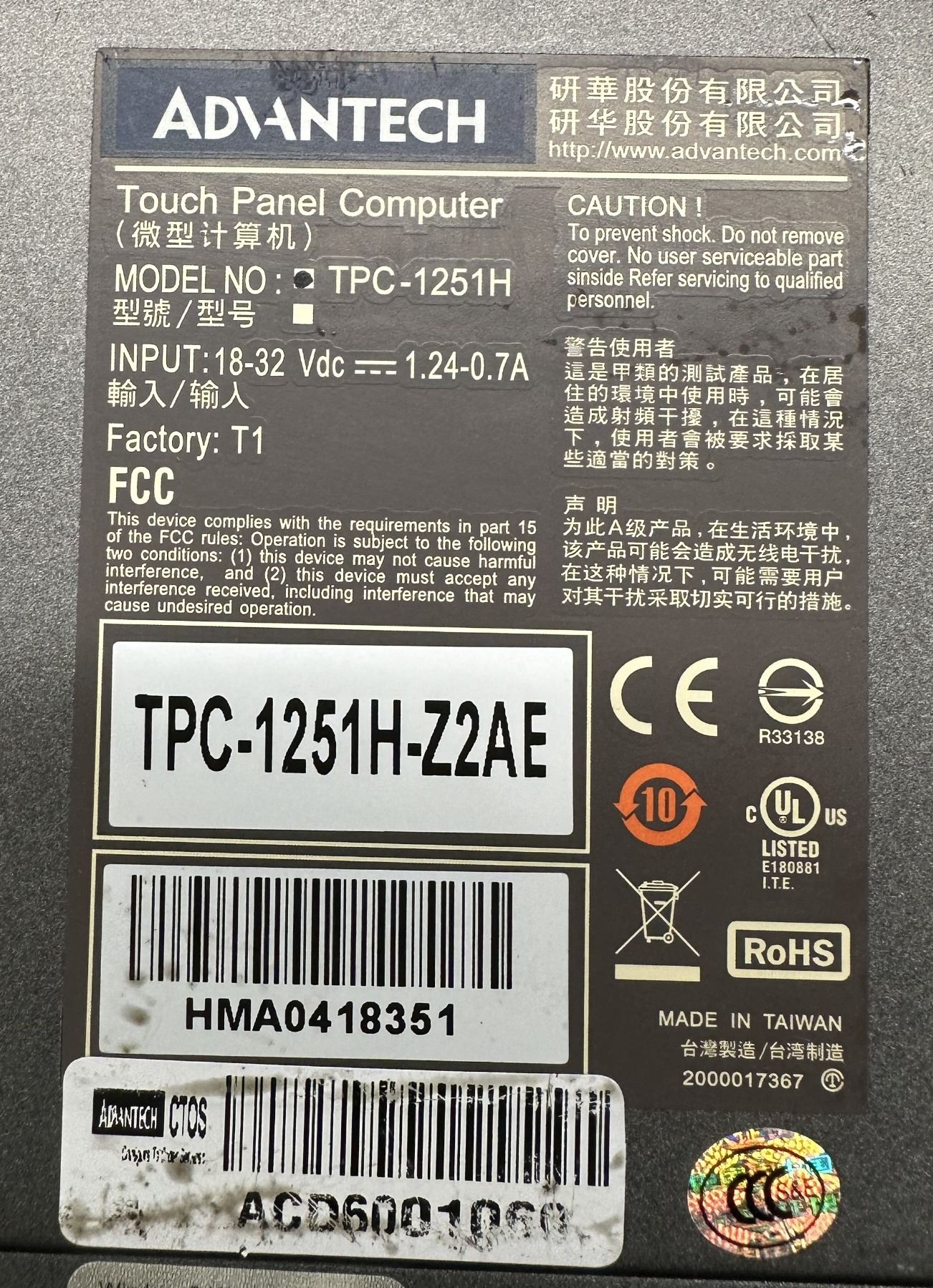 Advantech #TPC-1251H-Z2AE Touch Panel Computer