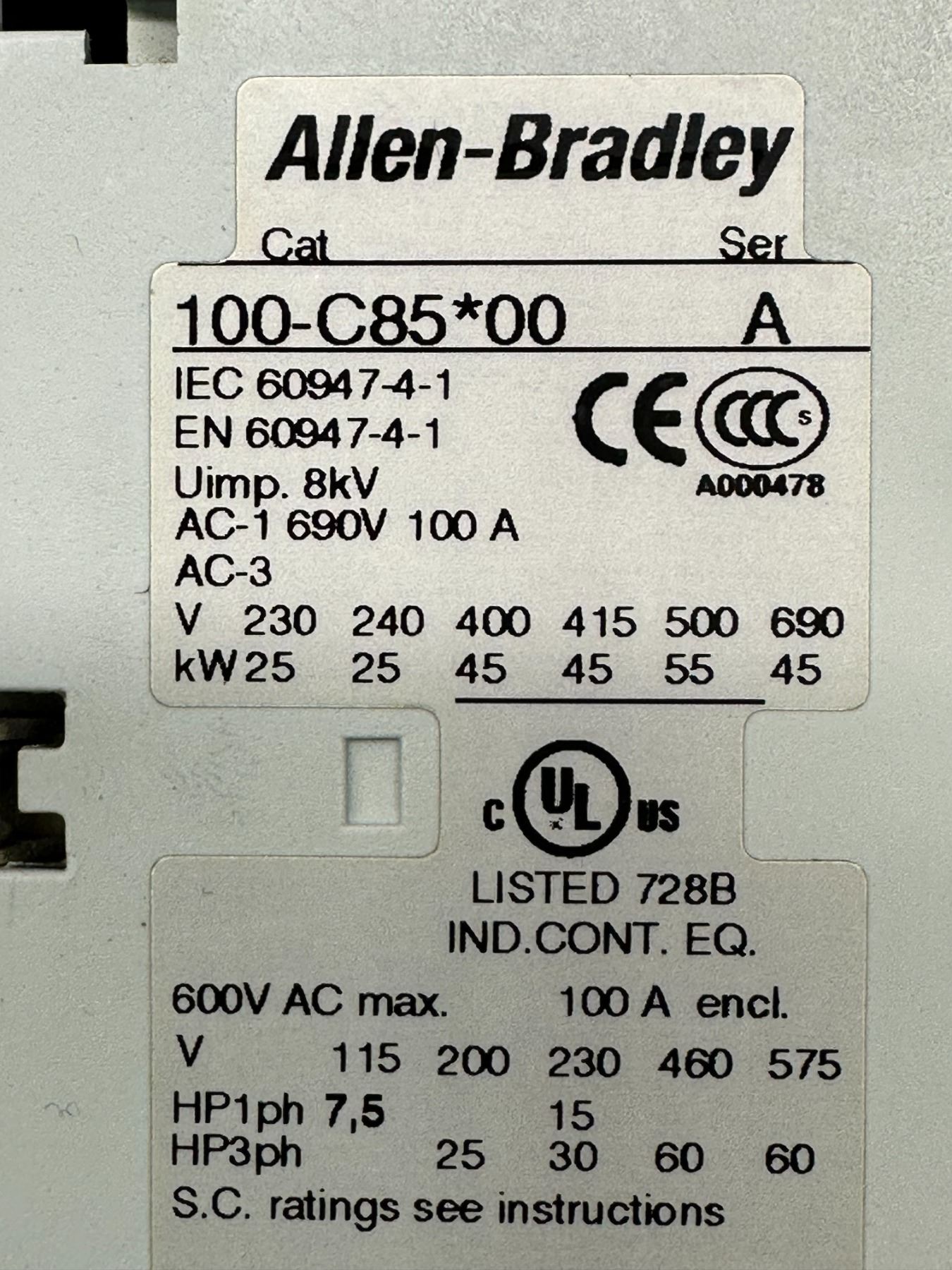Allen Bradley #100-C85*00 Series A Contactor 220 V 240V Coil