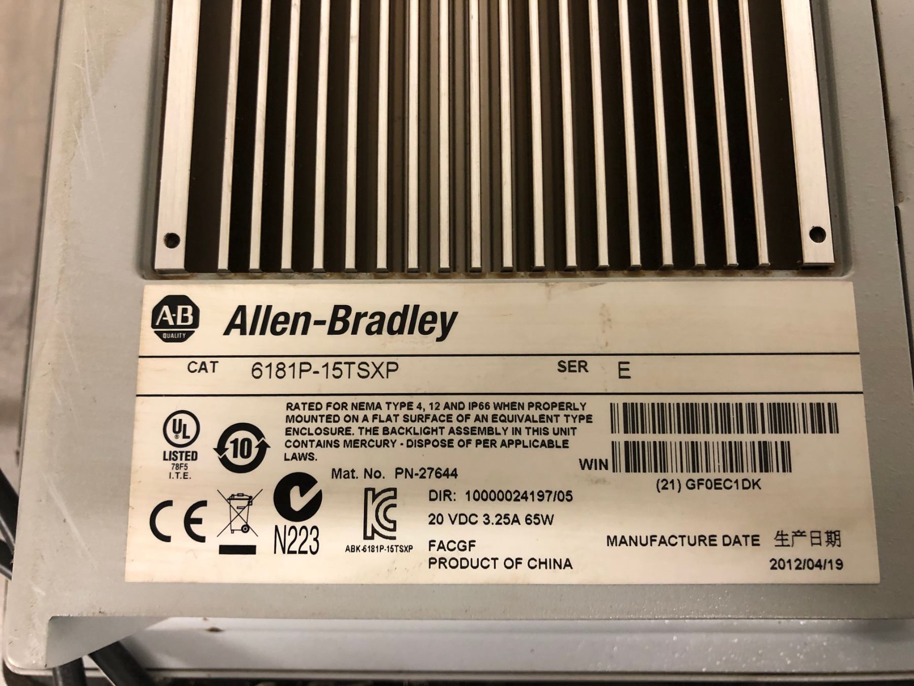 Allen-Bradley 1500P Integrated Touch Display, M/N: 6181P-15TSXP