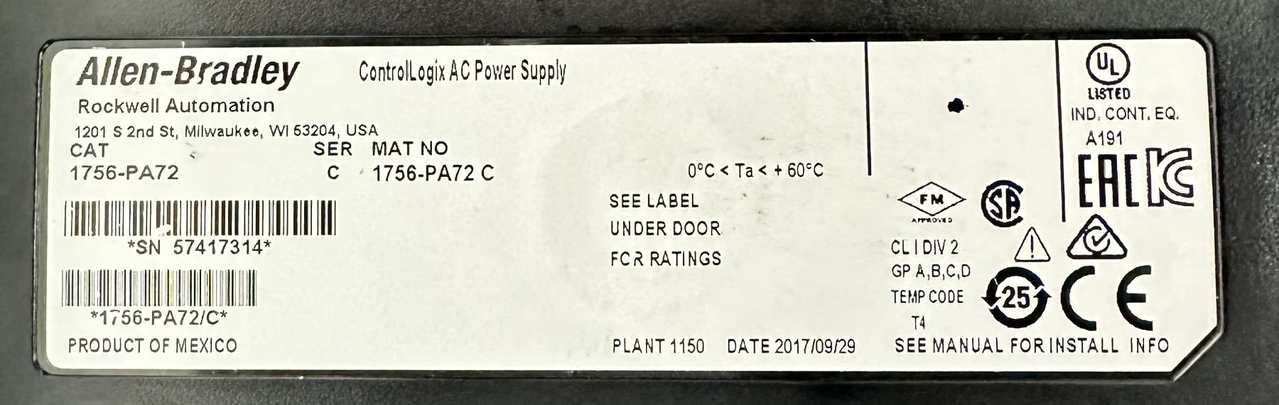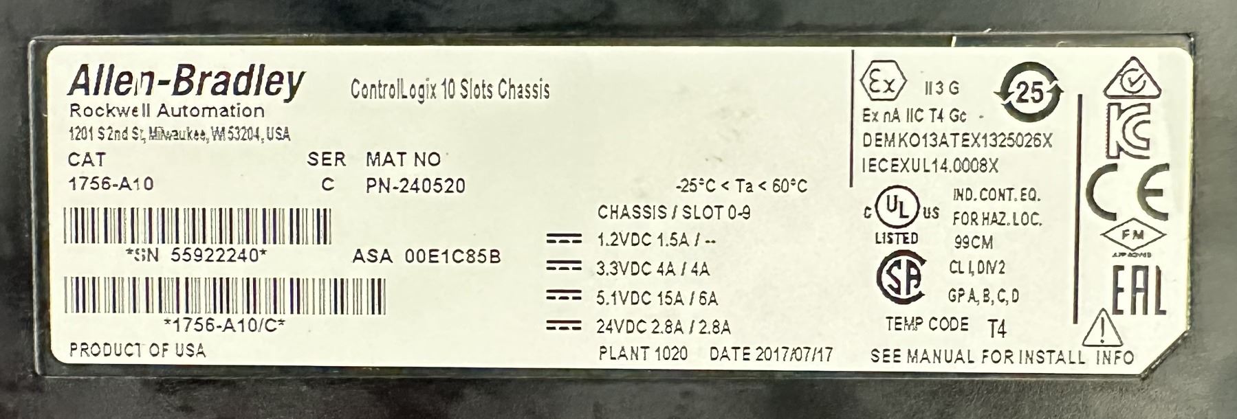Allen Bradley #1756-A10 Chassis w/#1756-PA72 Power Supply & Modules