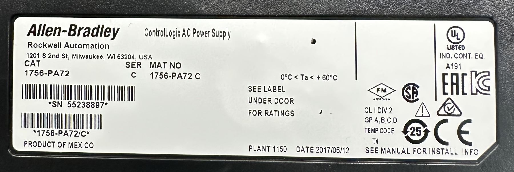 Allen Bradley #1756-PA72 Power Supply