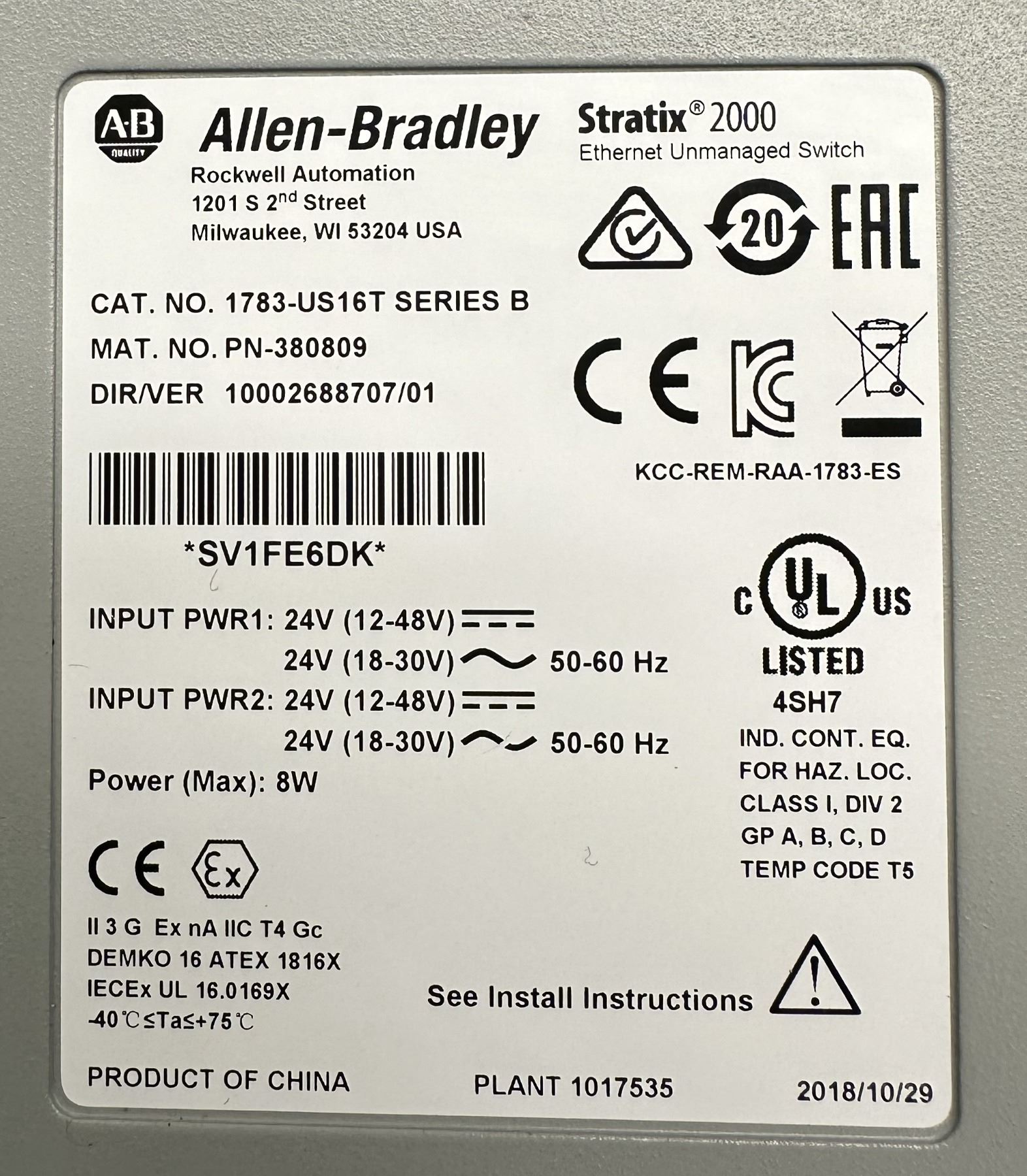 Allen Bradley #1783-US16T Stratix 2000 Ethernet Unmanaged Switch