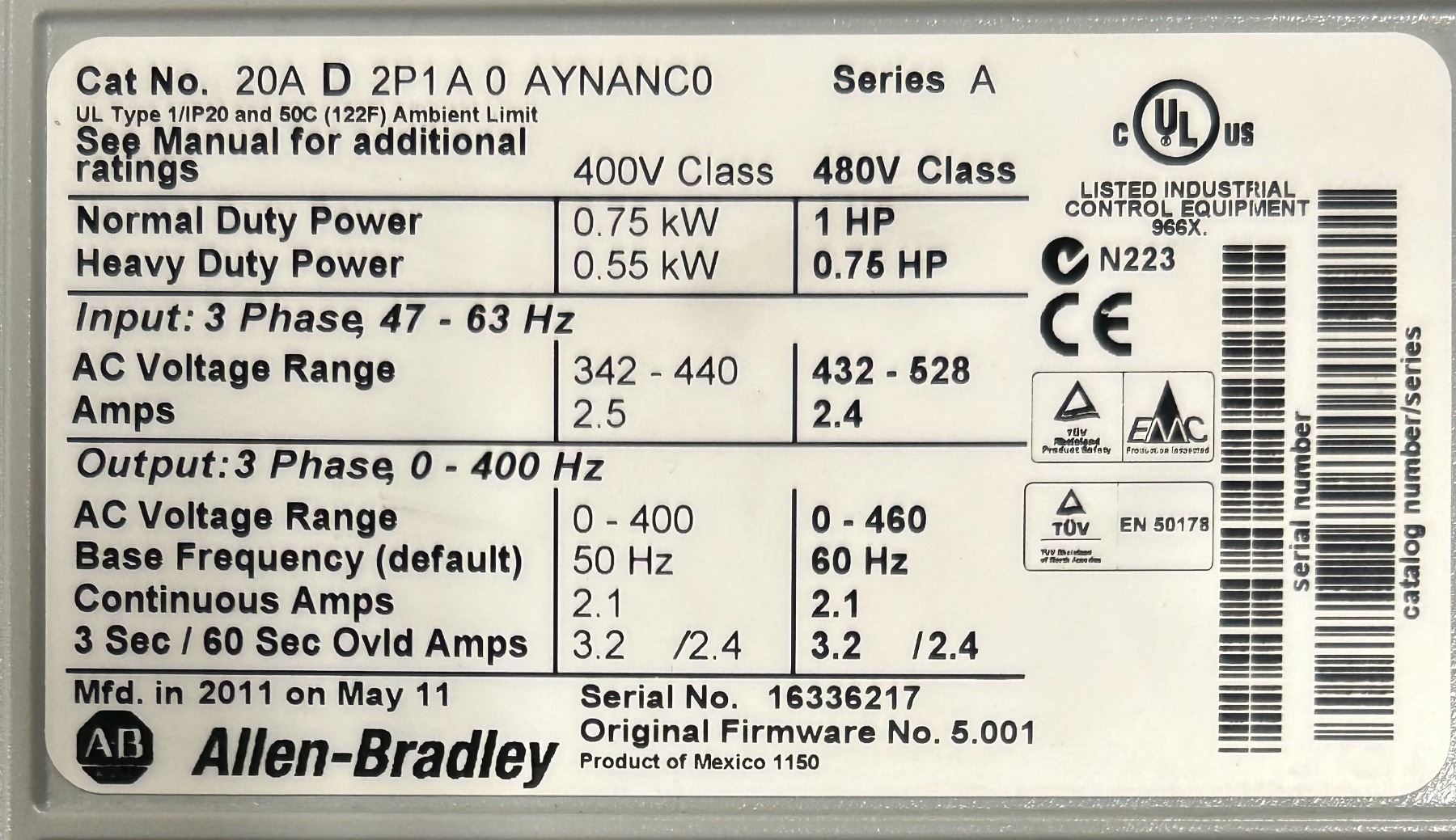 Allen-Bradley #20A D 2P1 A 0 AYNANC0 PowerFlex 70 Drive