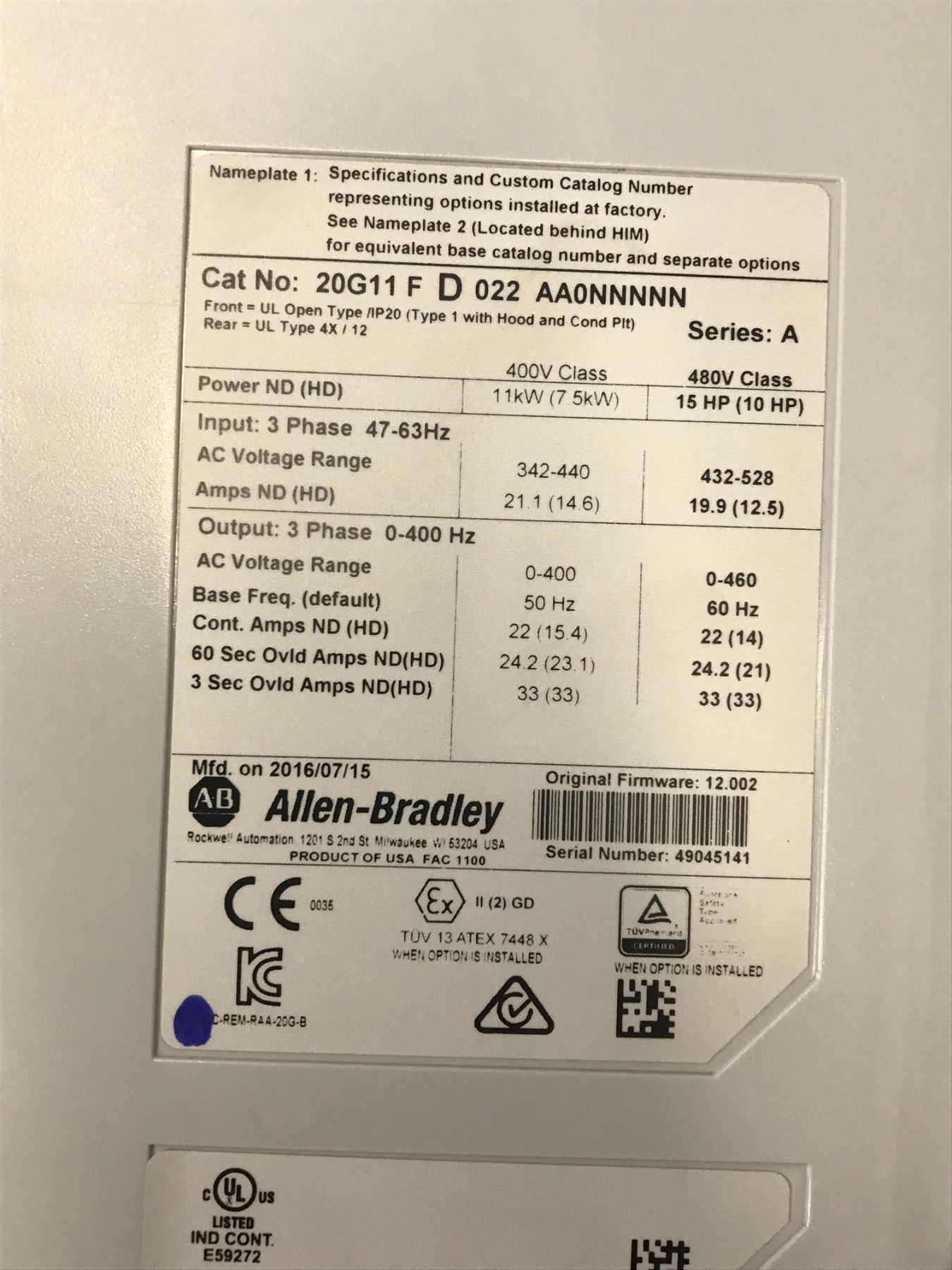 Allen Bradley #20G11F D 022 AA0NNNNN Power Flex Drive