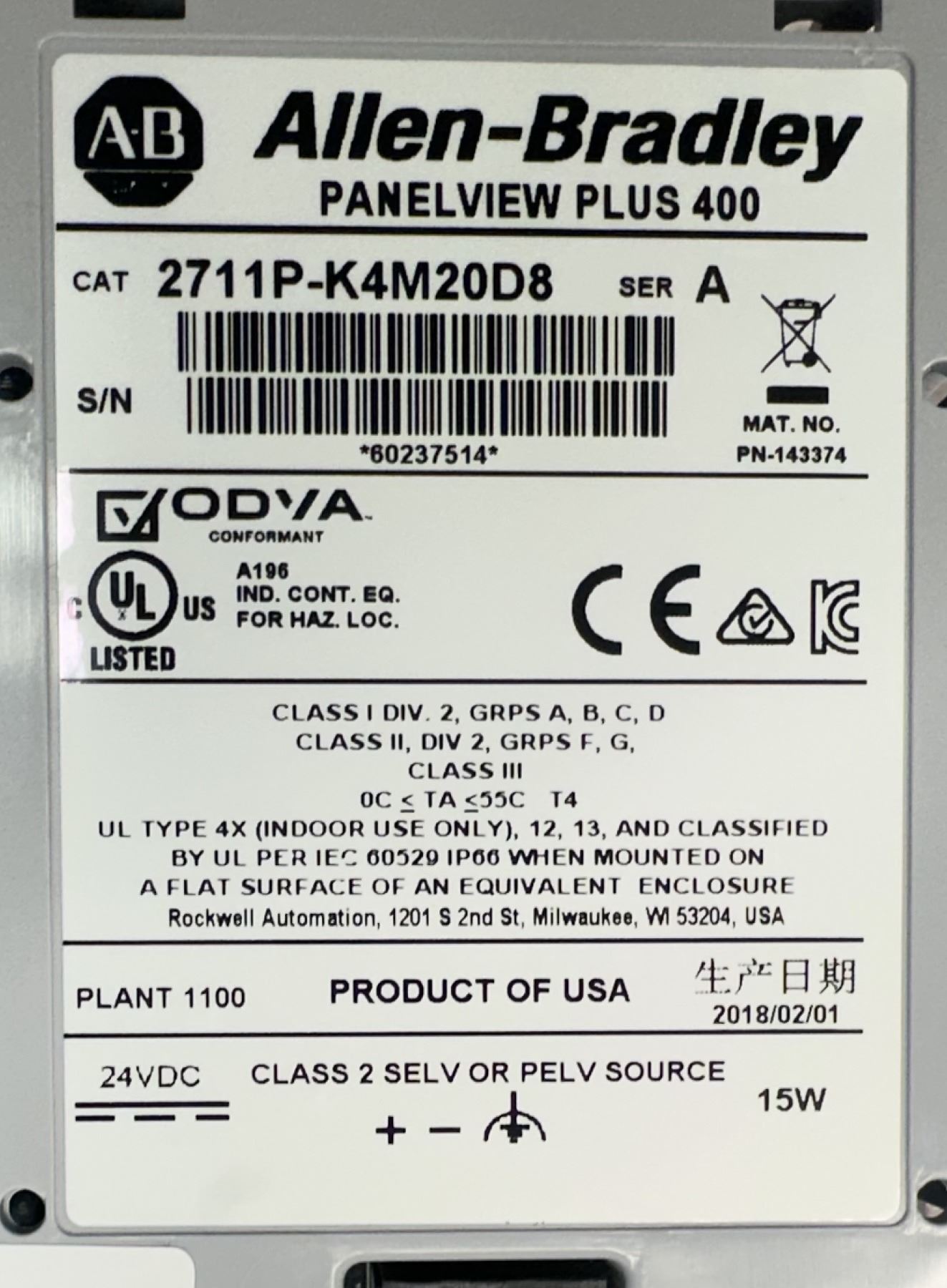 Allen Bradley #2711P-K4M20D8 Panelview Plus 400