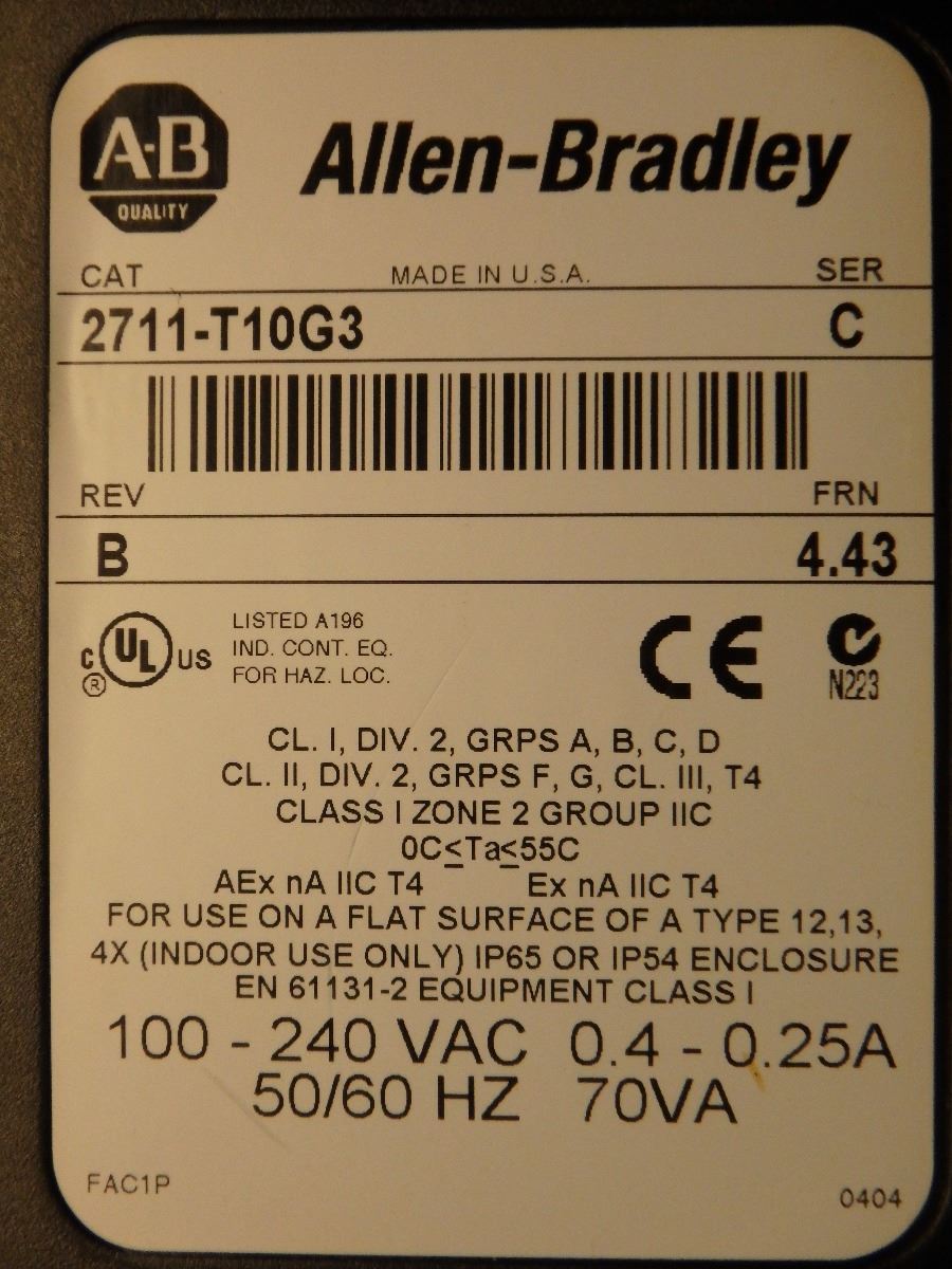 Allen Bradley Panelview 1000 Cat #2711-T10G3 Ser C