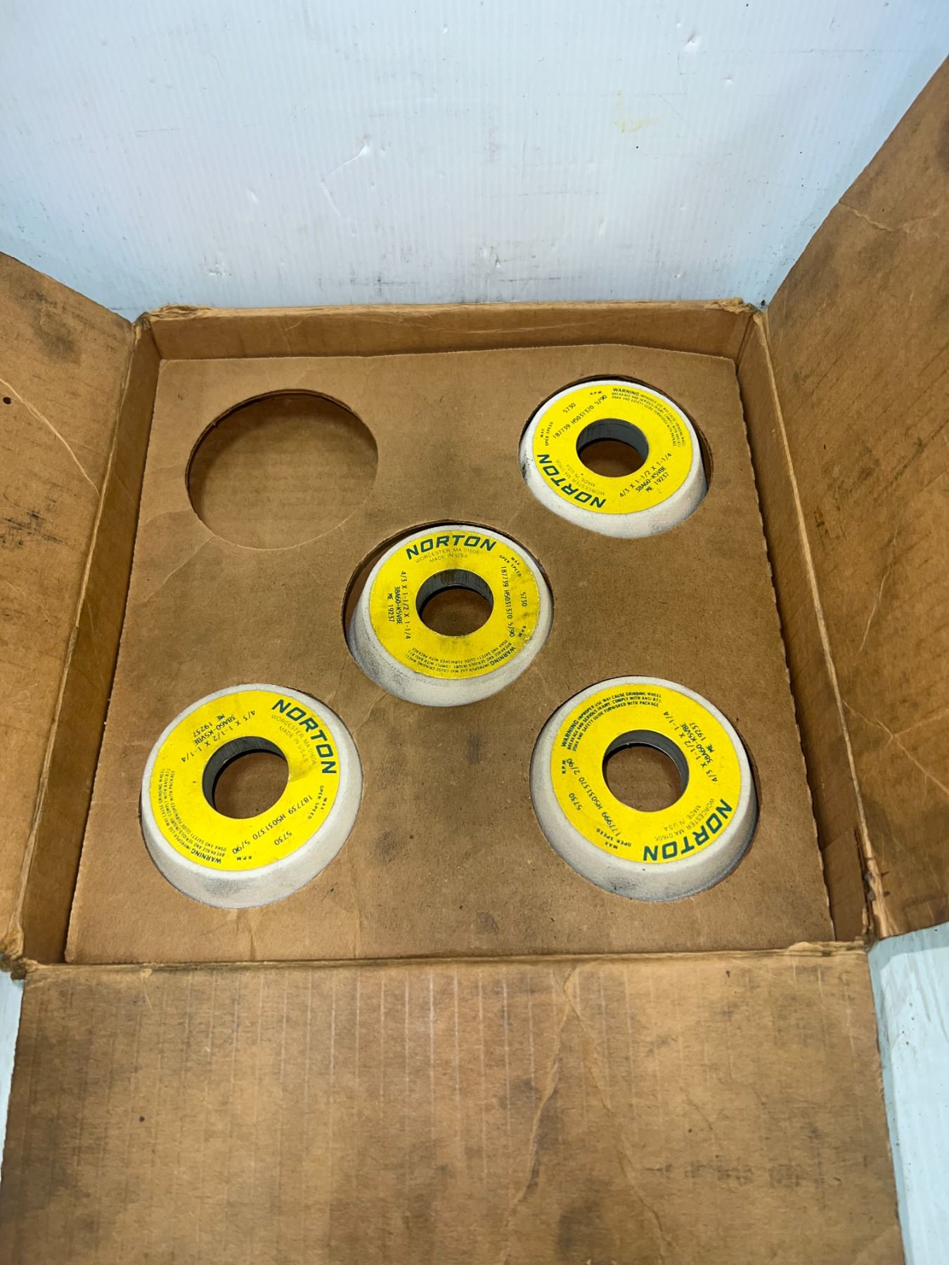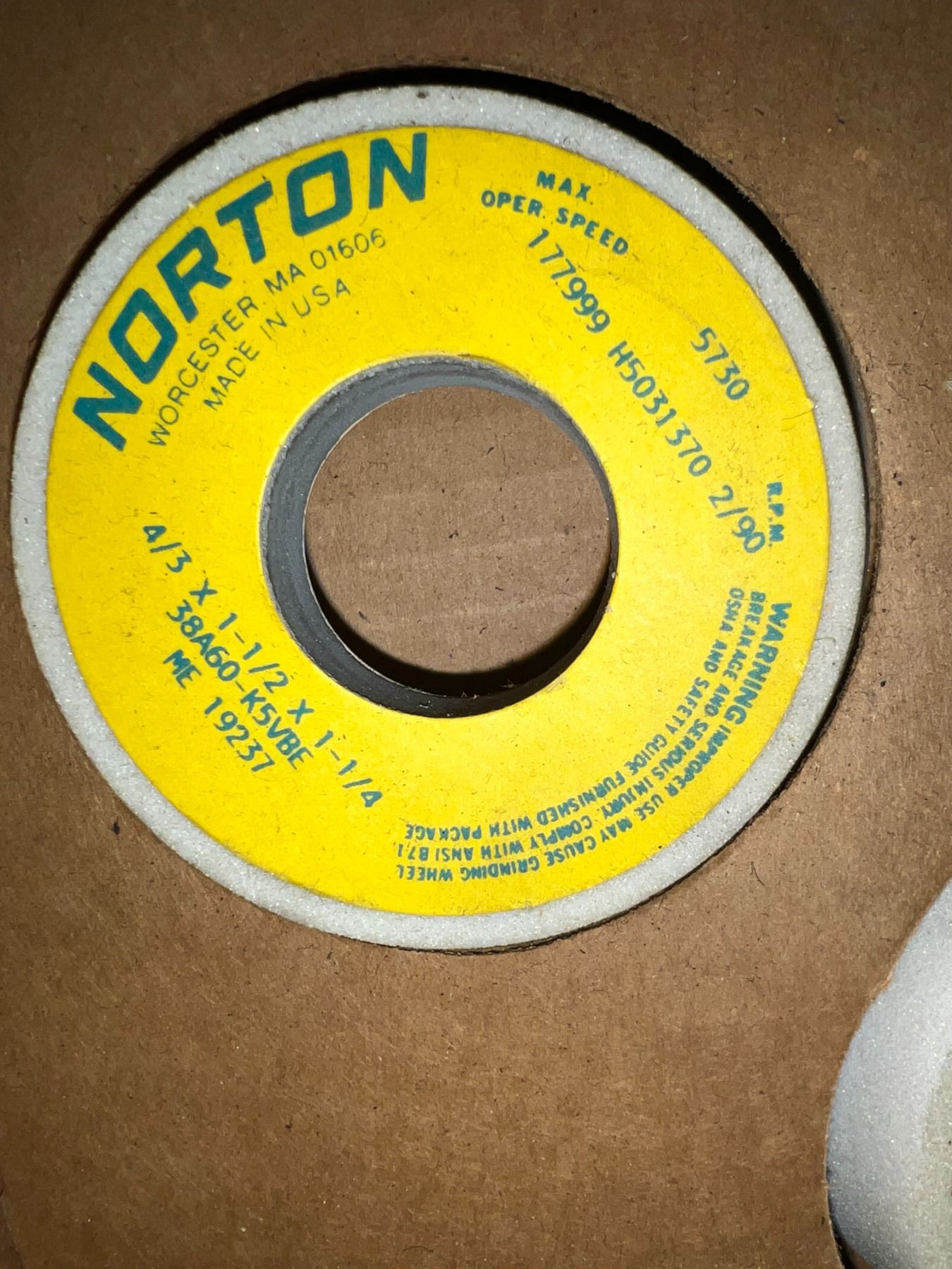 Box Lot of (9) Norton #4/3 X 1-1/2 X1-1/4 / #38A60-K5VBE Grinding Wheels