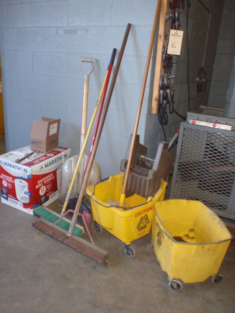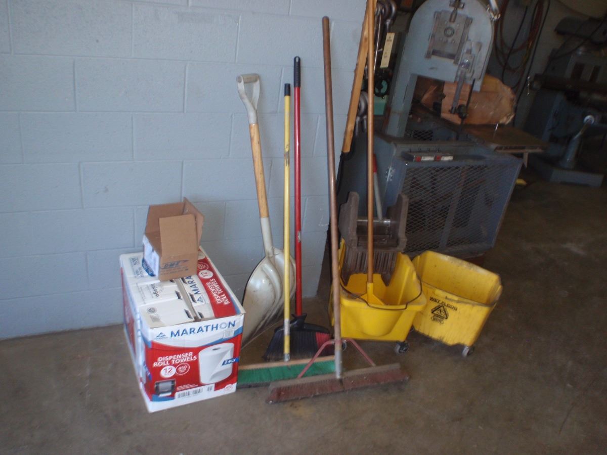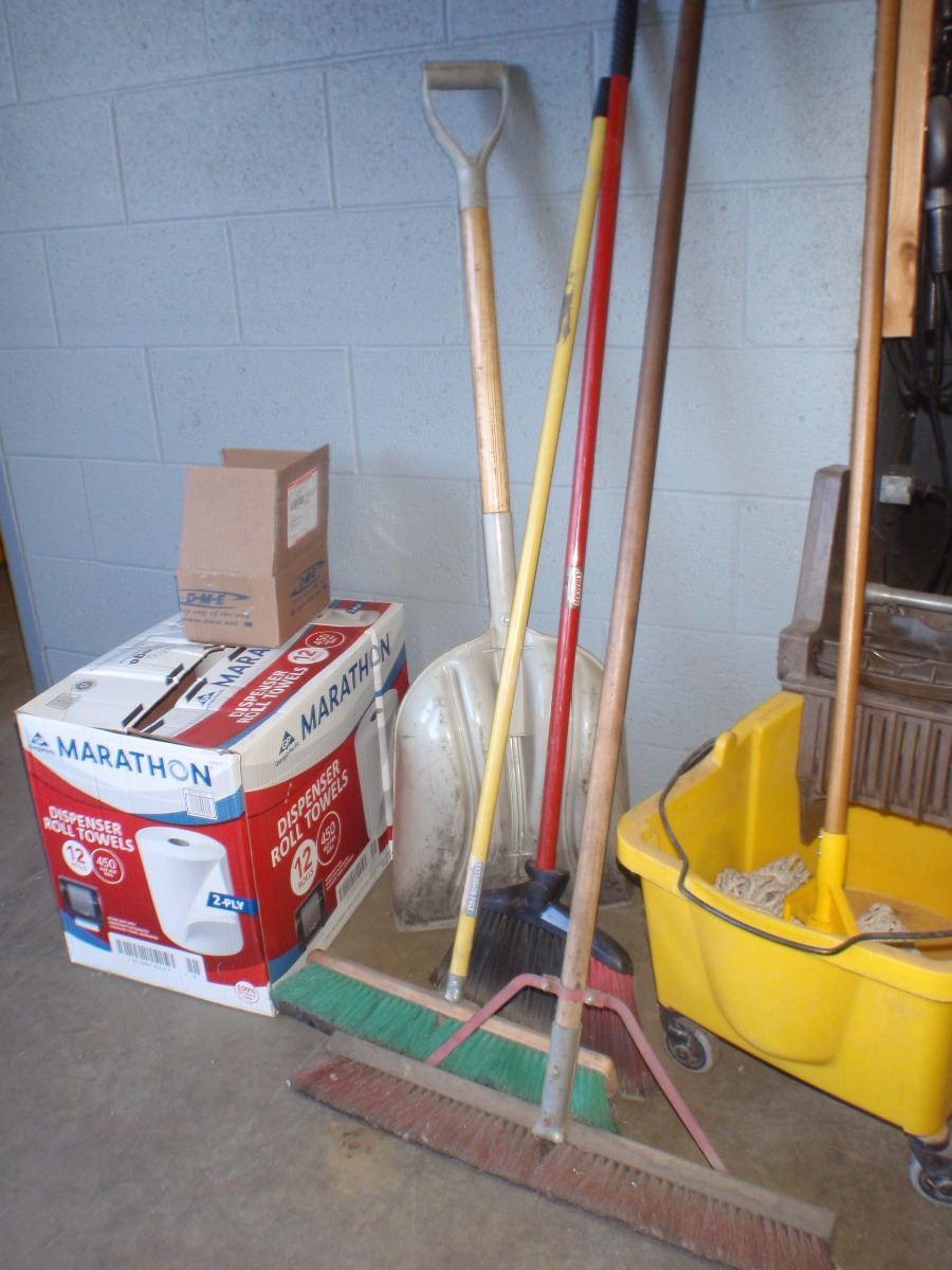 Cleaning Supplies Includes Brooms, Shovels, Mop Buckets Towels