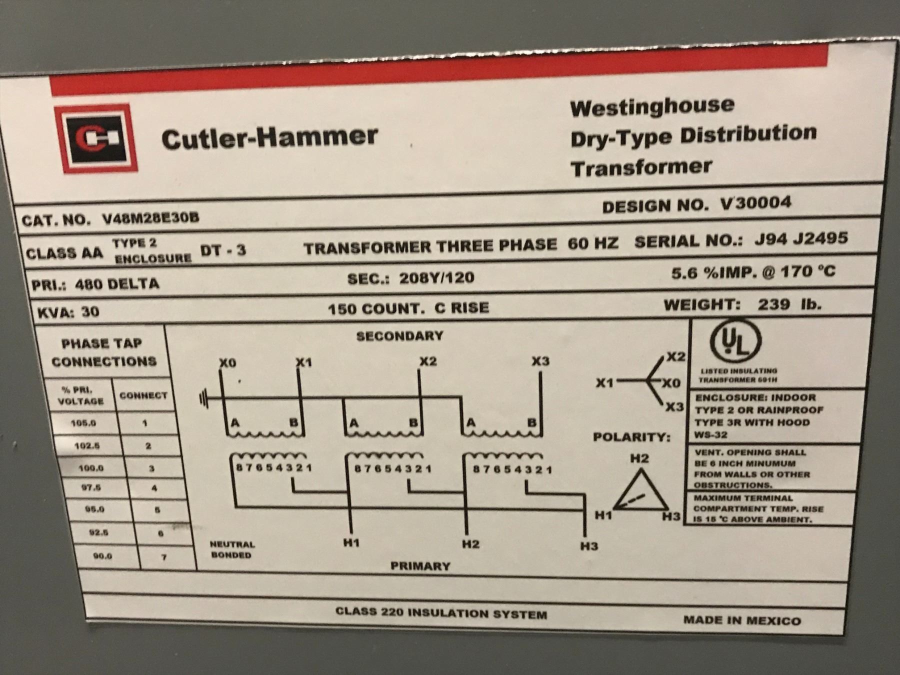Cutler Hammer V48M28E30B Transformer 3 Phase