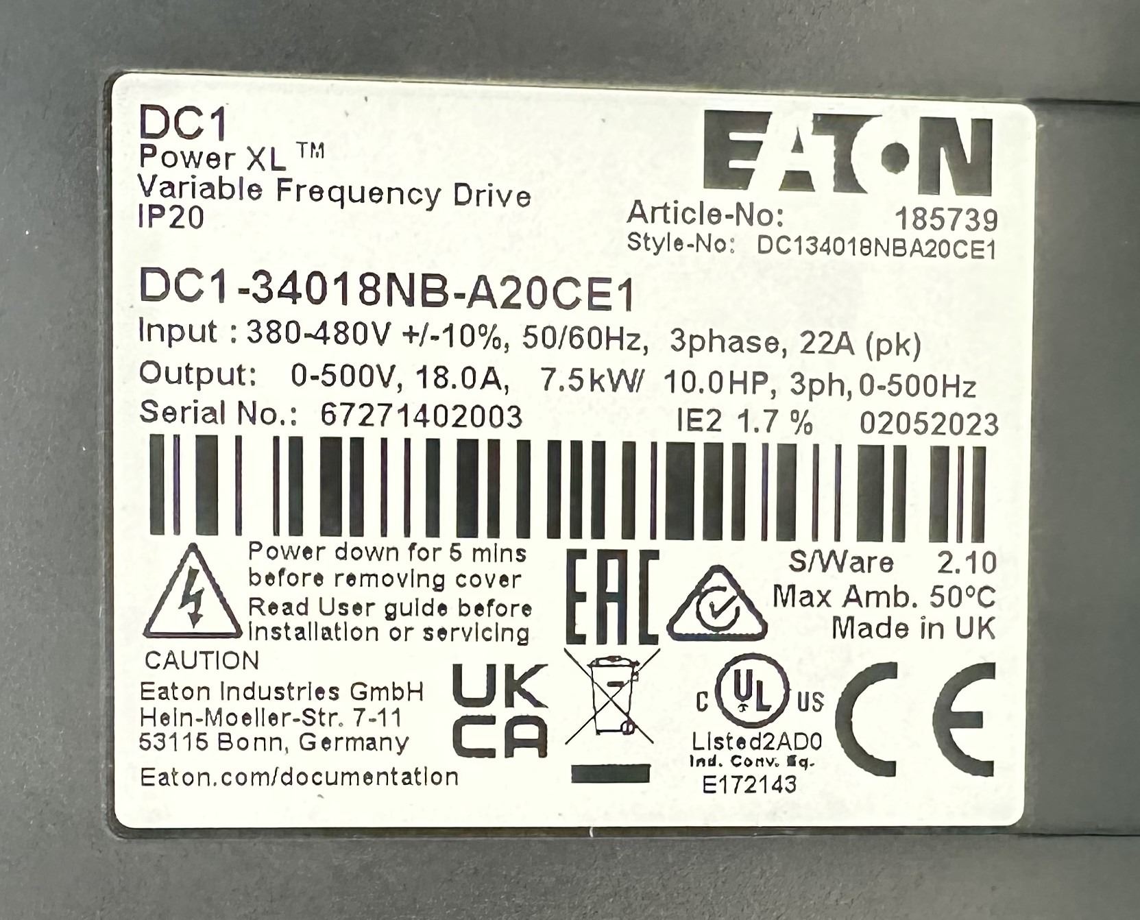 Eaton #DC1-34018NB-A20CE1 Power XL Variable Frequency Drive