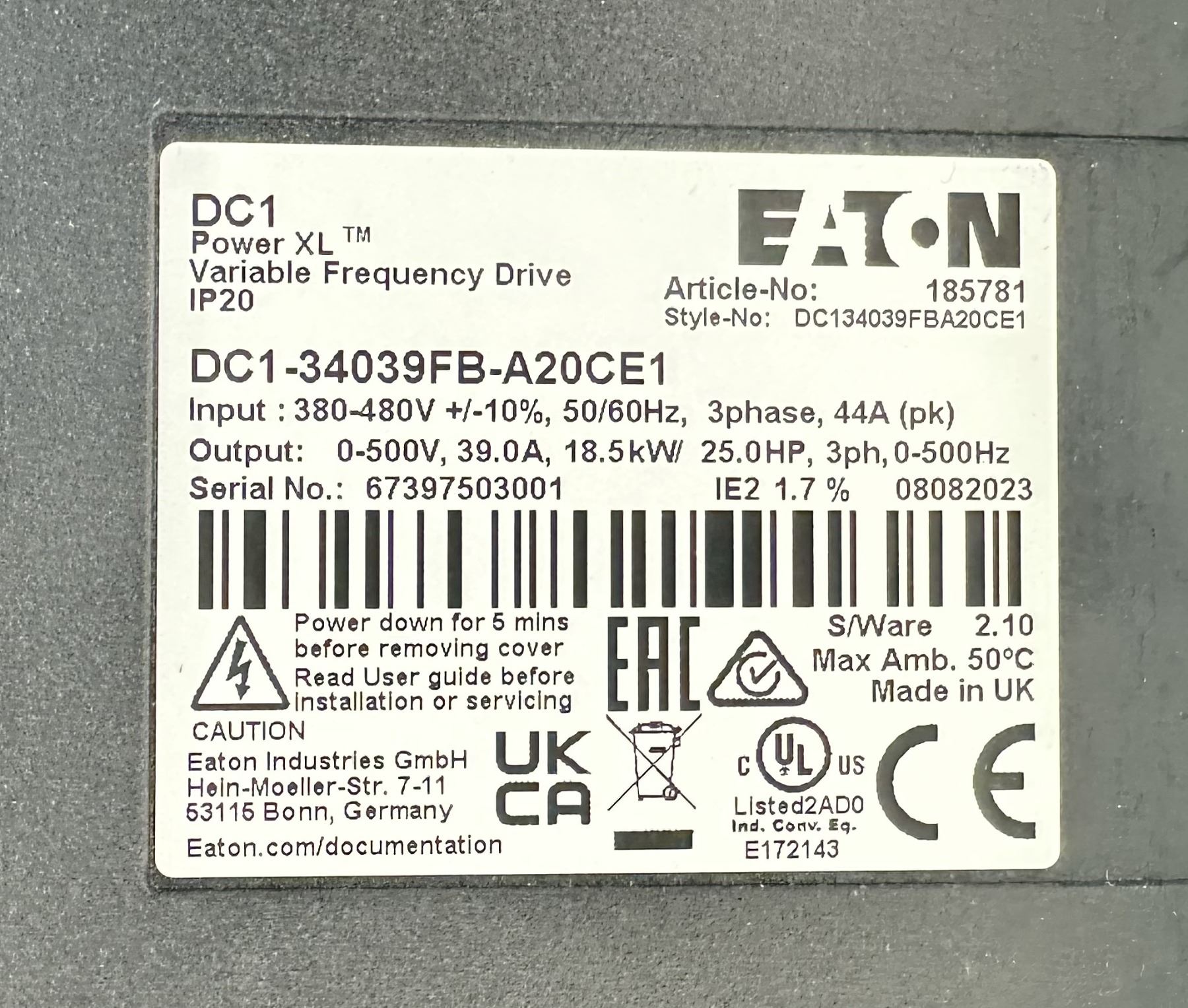 Eaton #DC1-34039FB-A20CE1 Power XL Variable Frequency Drive