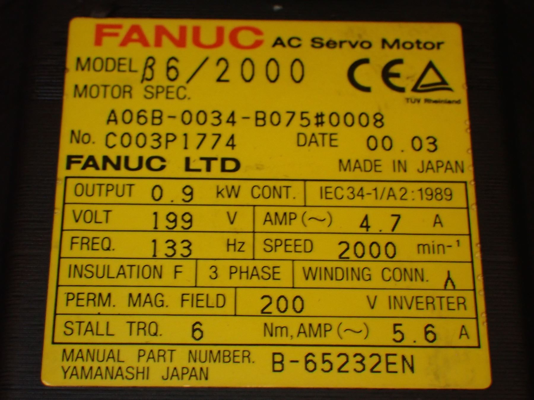 Fanuc # A06B-0034-B075#0008 AC Servo Motor