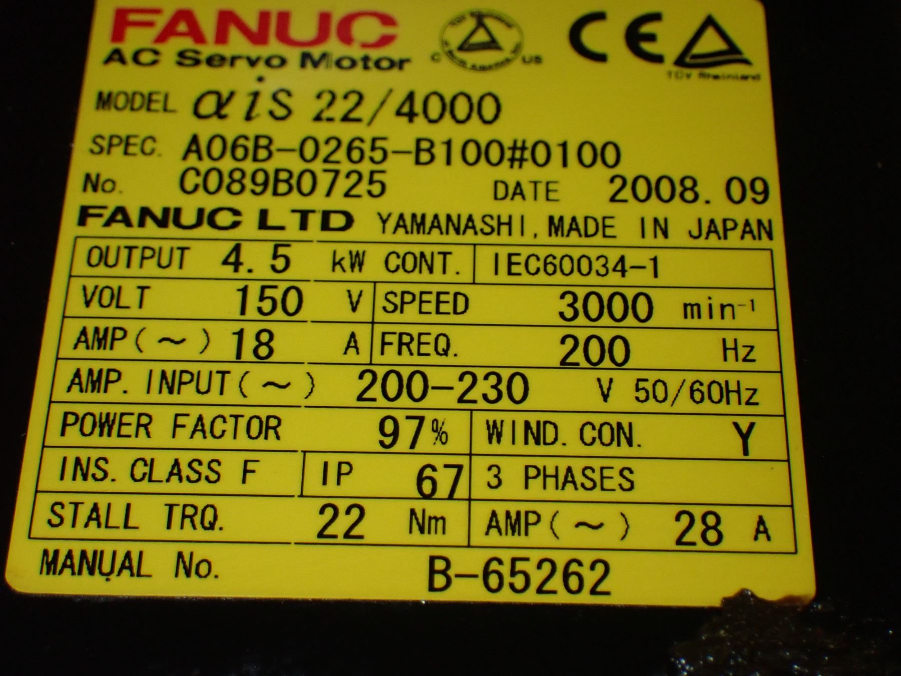 Fanuc # A06B-0265-B100#0100 AC Servo Motor
