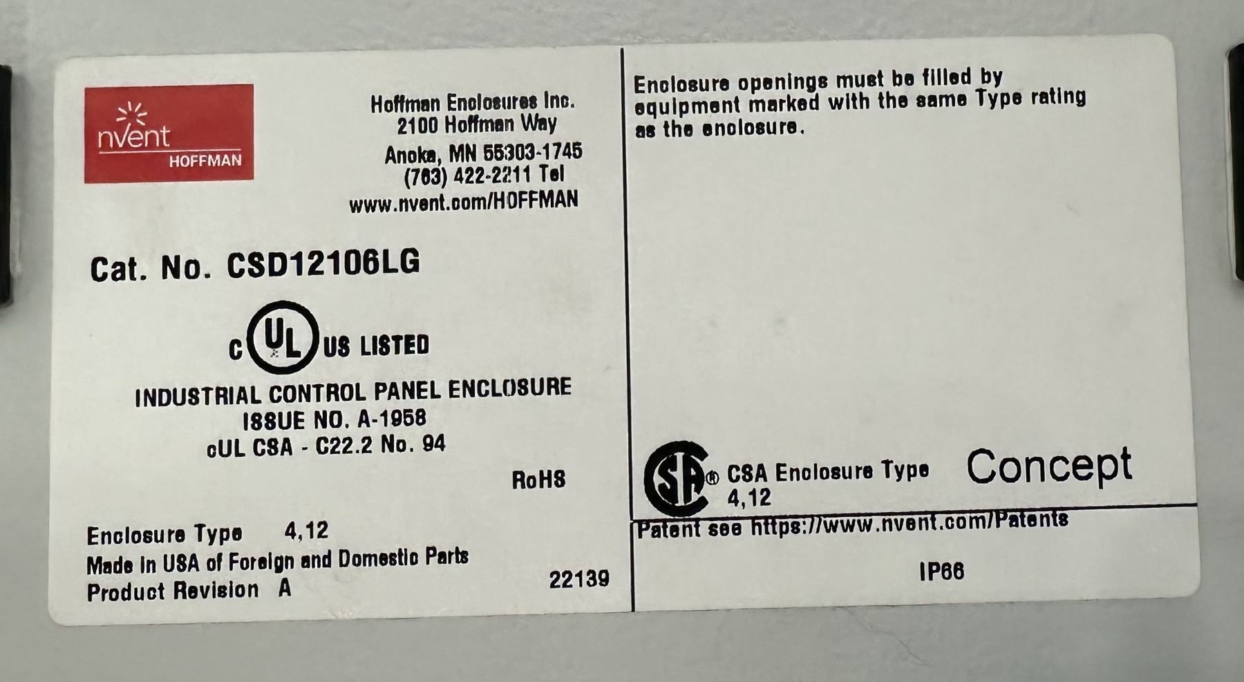 Hoffman #CSD12106LG Industrial Control Panel Enclosure