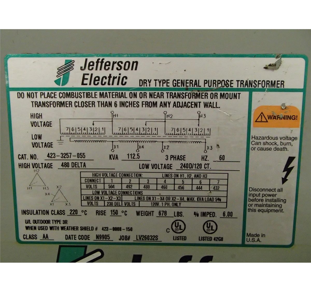 Jefferson Electric, Dry Type Transformer, M/N-423-3257-055, 112.5KVA