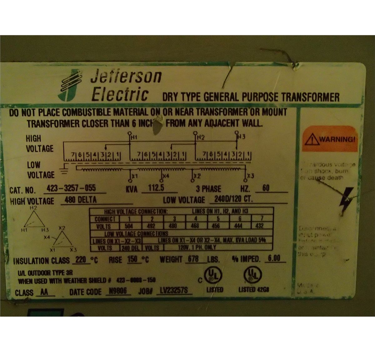 Jefferson Electric, Dry Type Transformer, M/N-423-3257-055, 112.5KVA