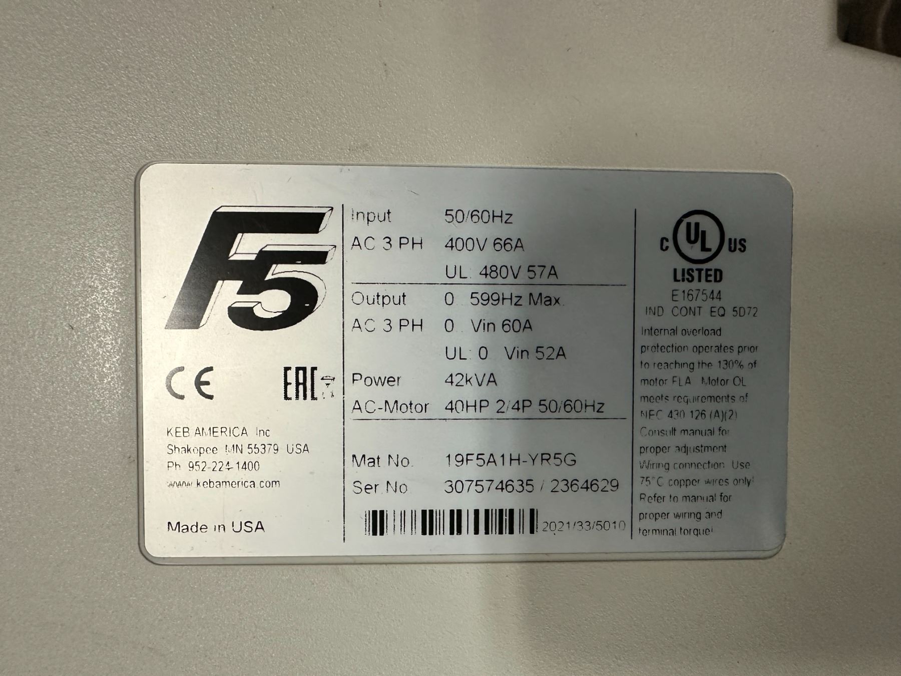 Keb #19F5A1H-YR5G Variable Frequency Drive