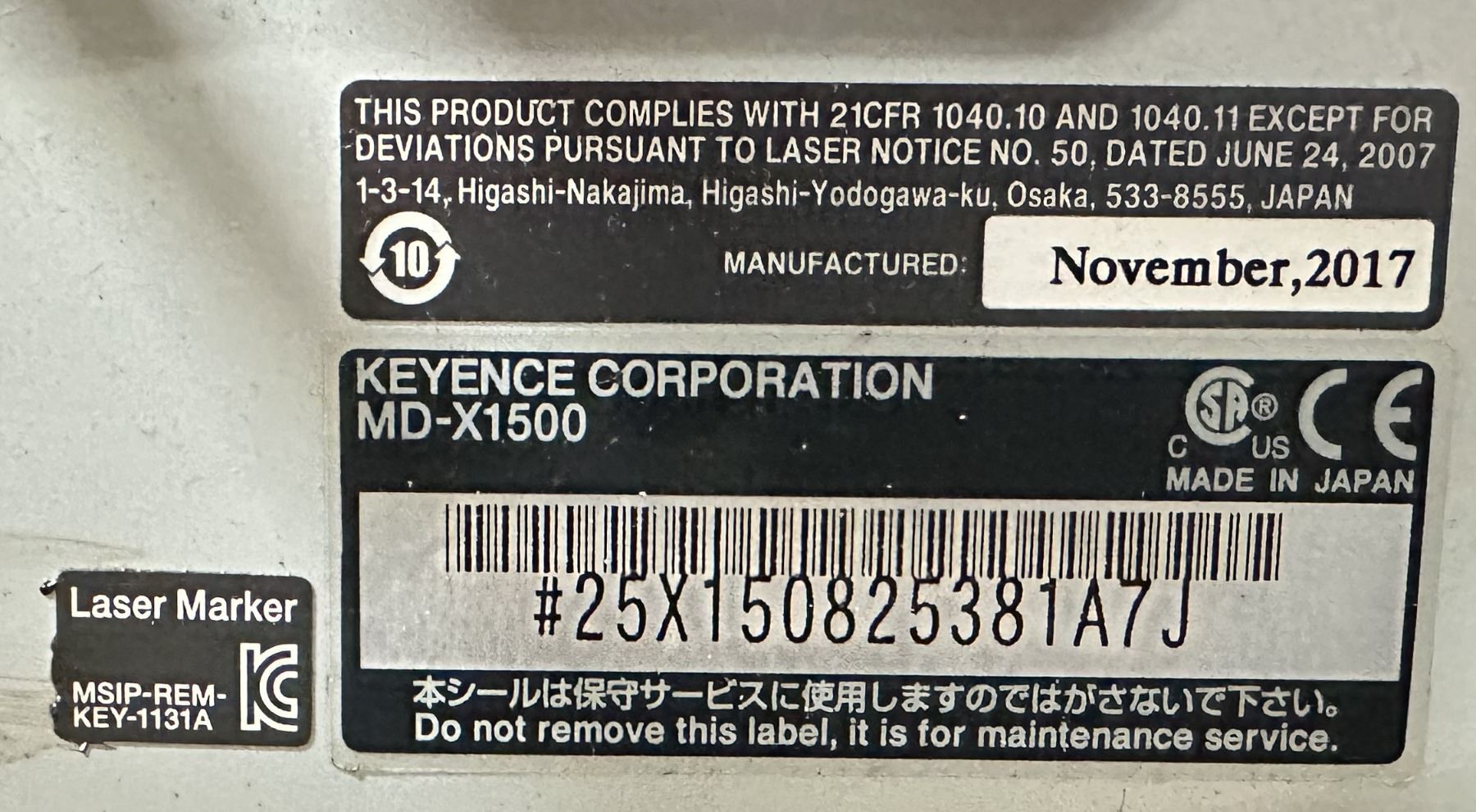 Keyence #MD-X1500 3-Axis Hybrid Laser Marker w/Power Supply / Controller