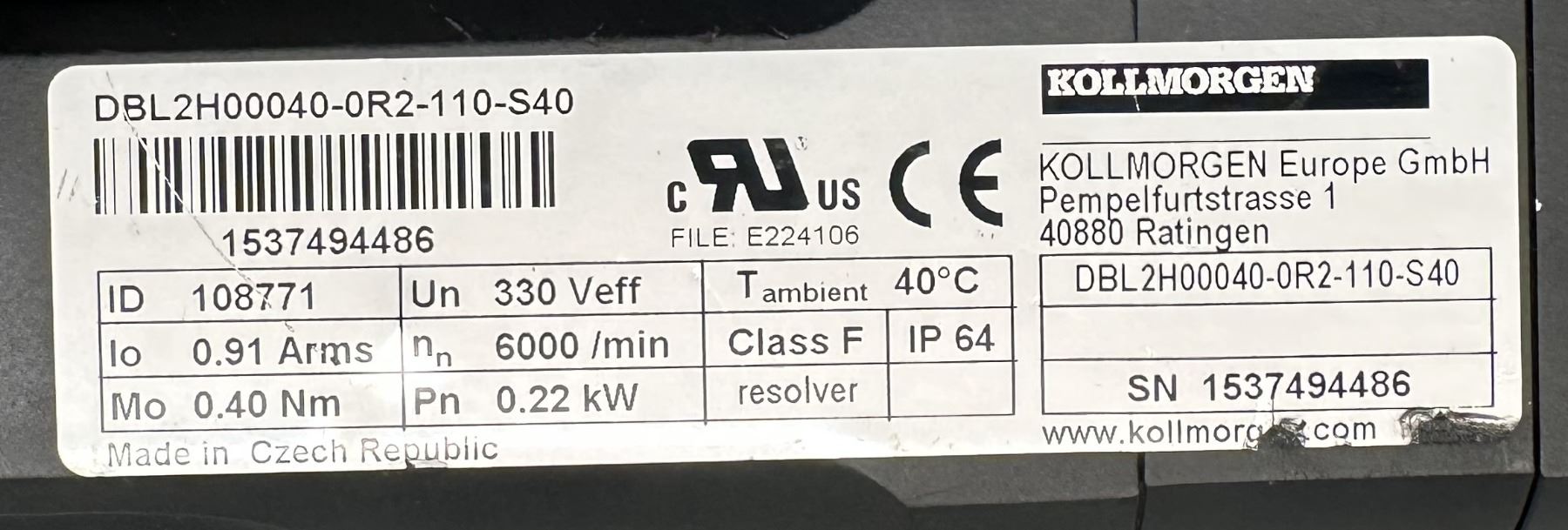 Kollmorgen #DBL2H00040-0R2-110-S40 Servo Motor