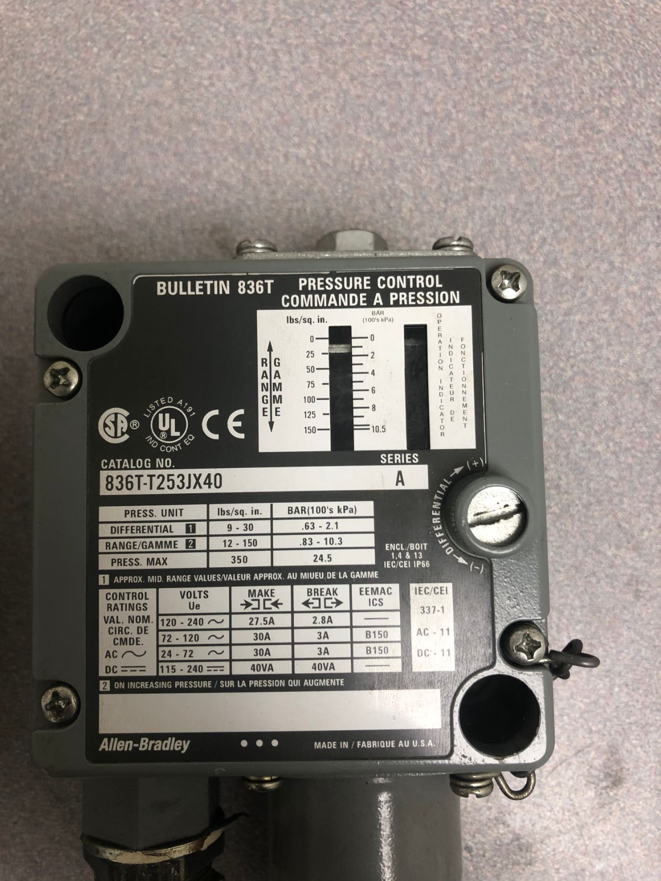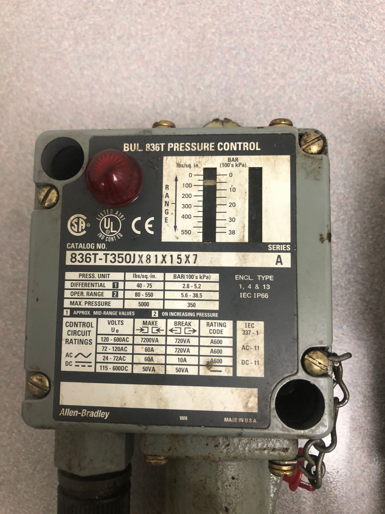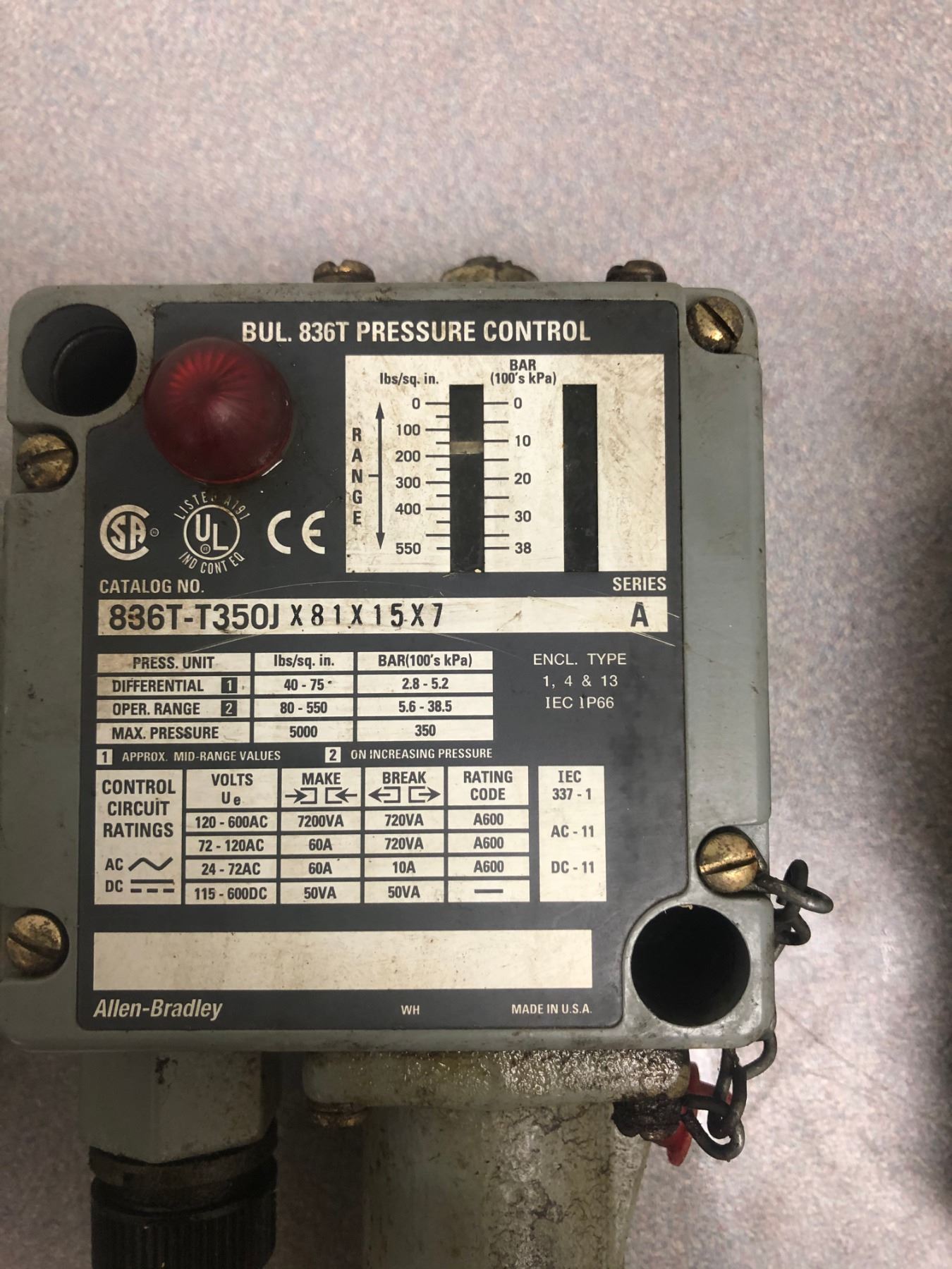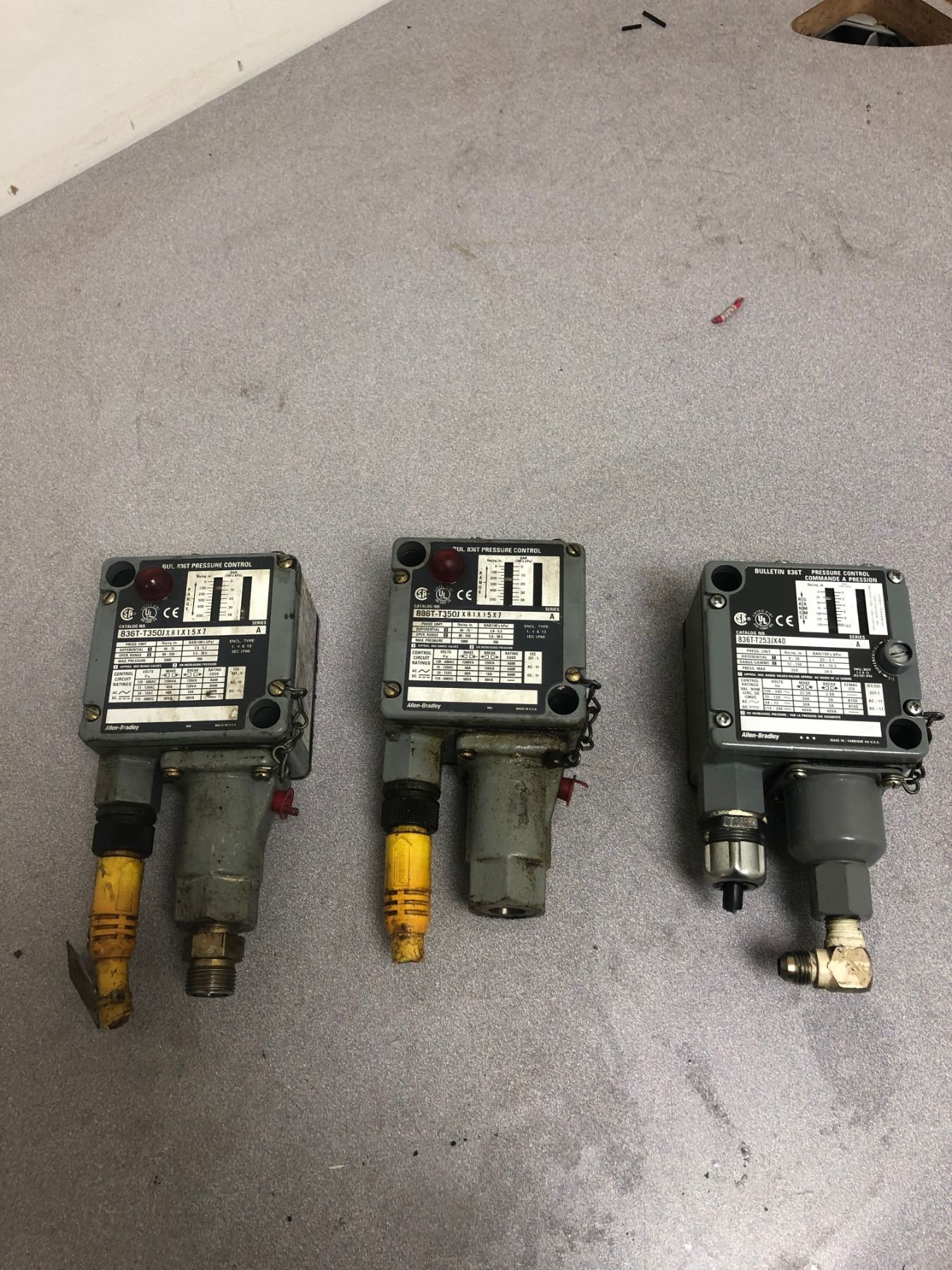 LOT OF ALLEN BRADLEY (2) 836T-T350JX81X15X7_(1) 836T-T253JX40_PRESSURE CONTROLS