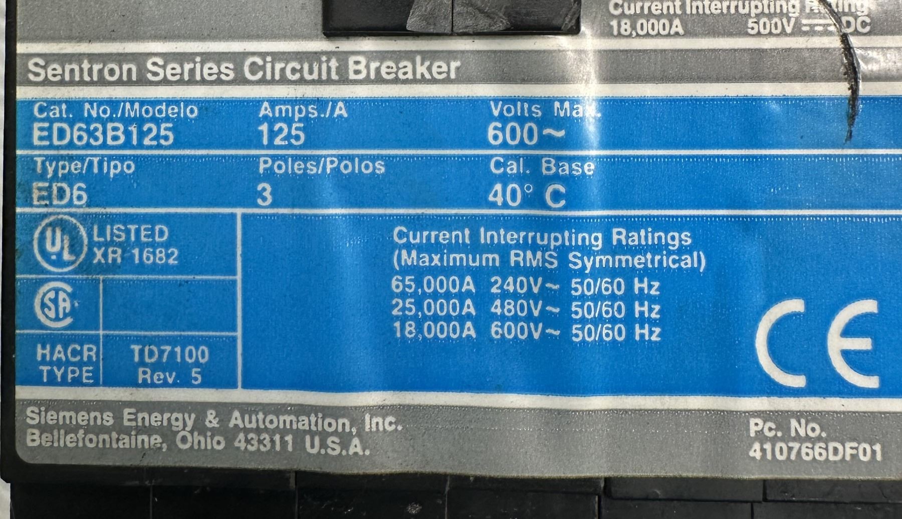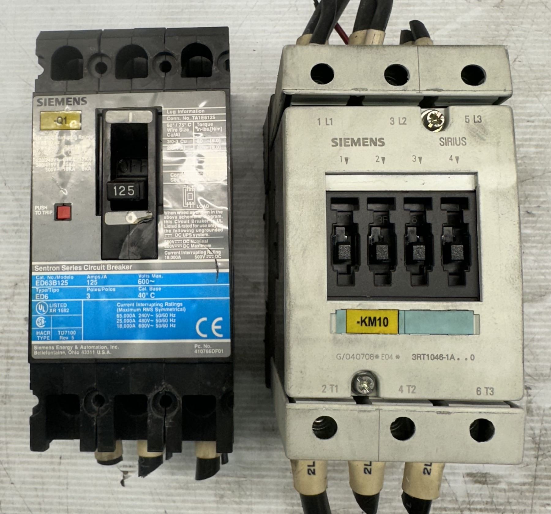 Lot of (2) Siemens #ED63B125 Circuit Breaker & #3RT1046-1AG20 Contactor