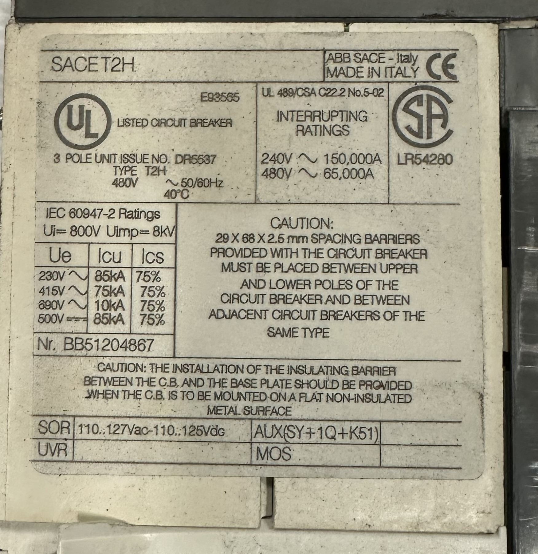 Lot of (7) ABB #SACE T2H Circuit Breakers