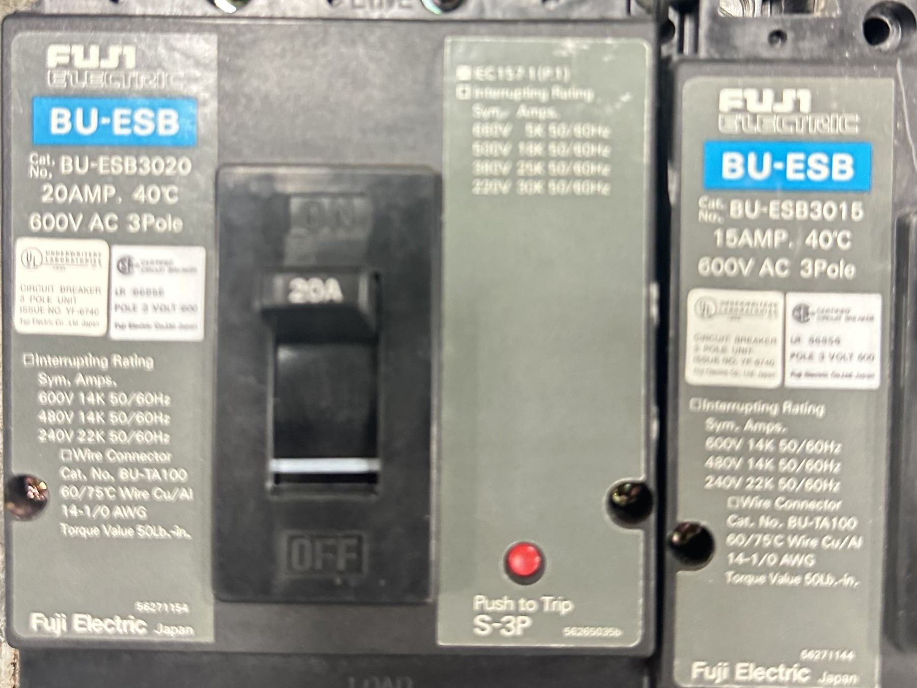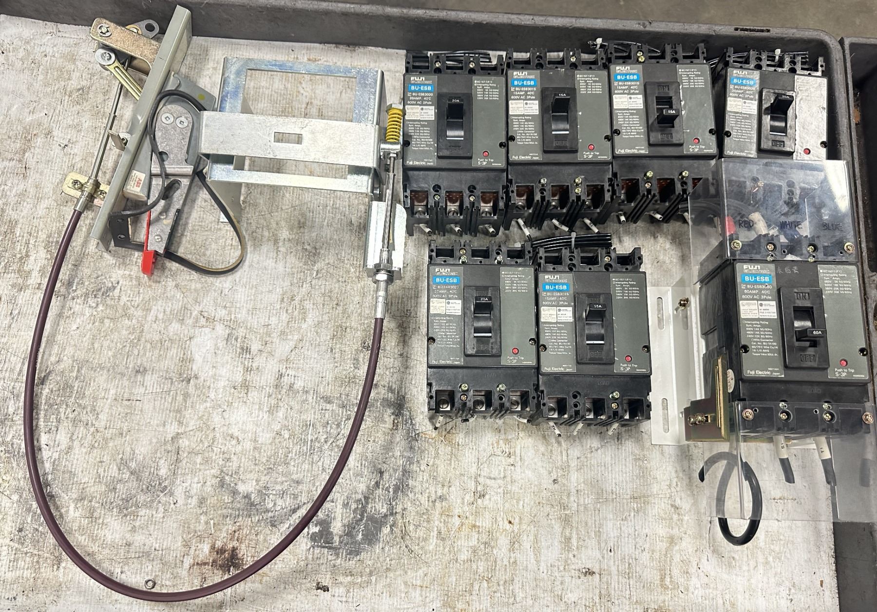 Lot of (7) Fuji #BU-ESB Circuit Breakers & #K5FCH Disconnect Switch Handle