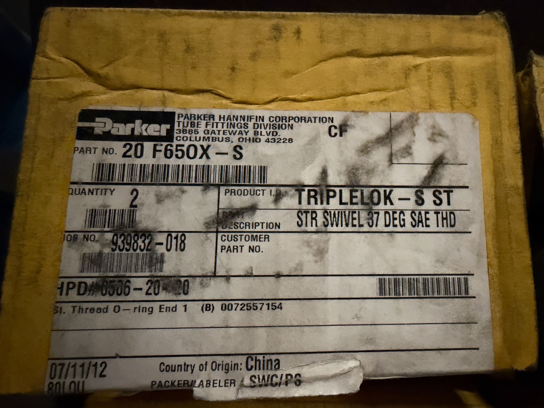Lot of Parker #20-F650X-S TRIPLELOK-S ST - STR SWIVEL 37 DEG SAE THD
