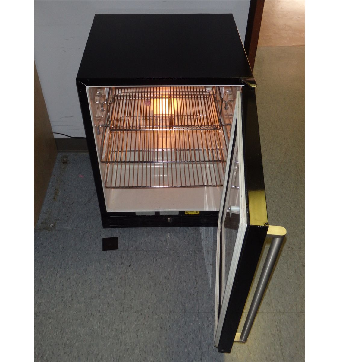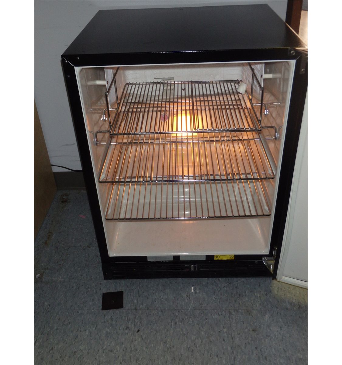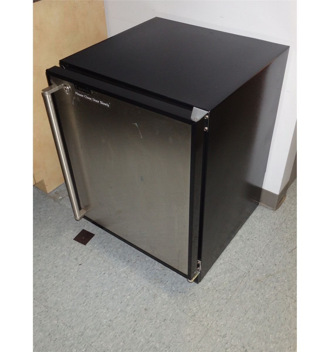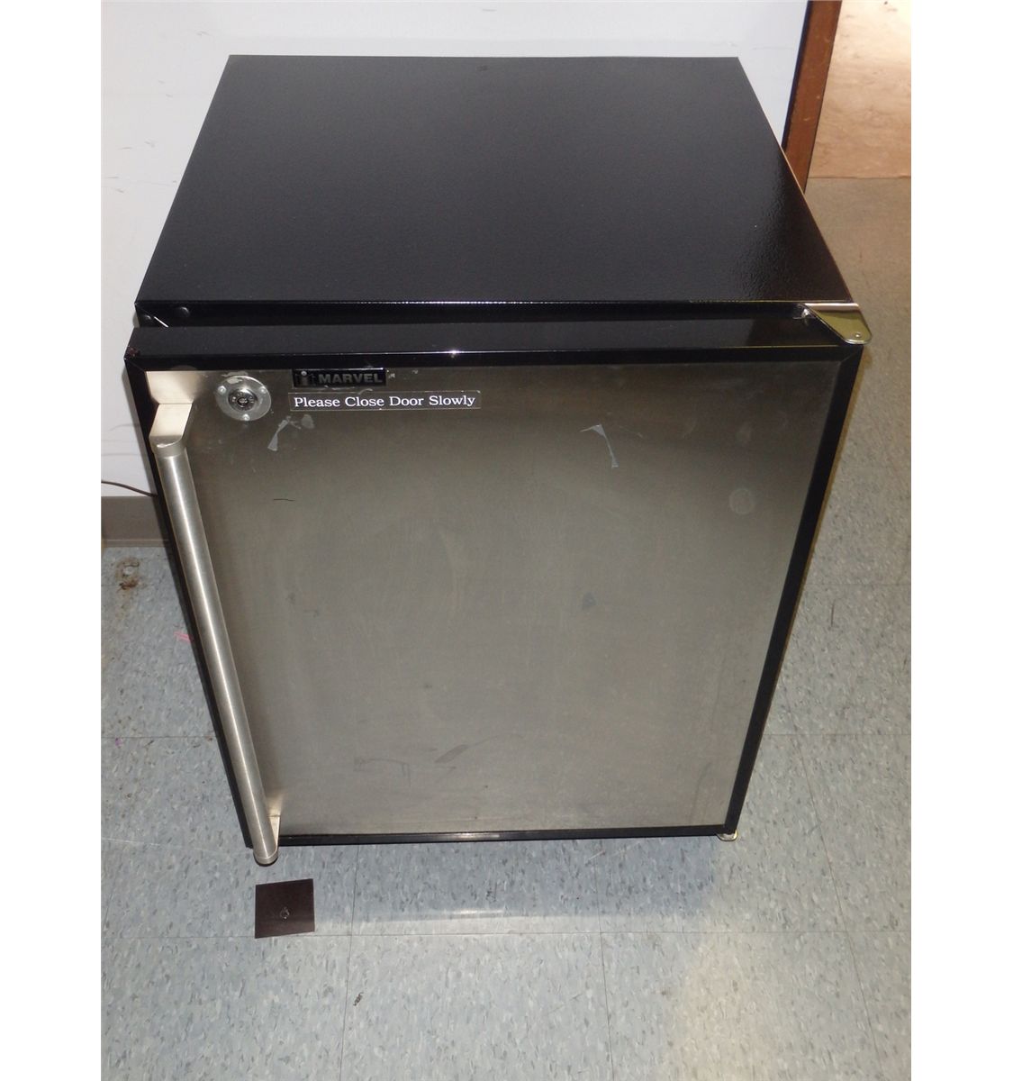 This is a Marvel stainless steel mini fridge. The dimensions of this fridge are 24" x 27" x 32"