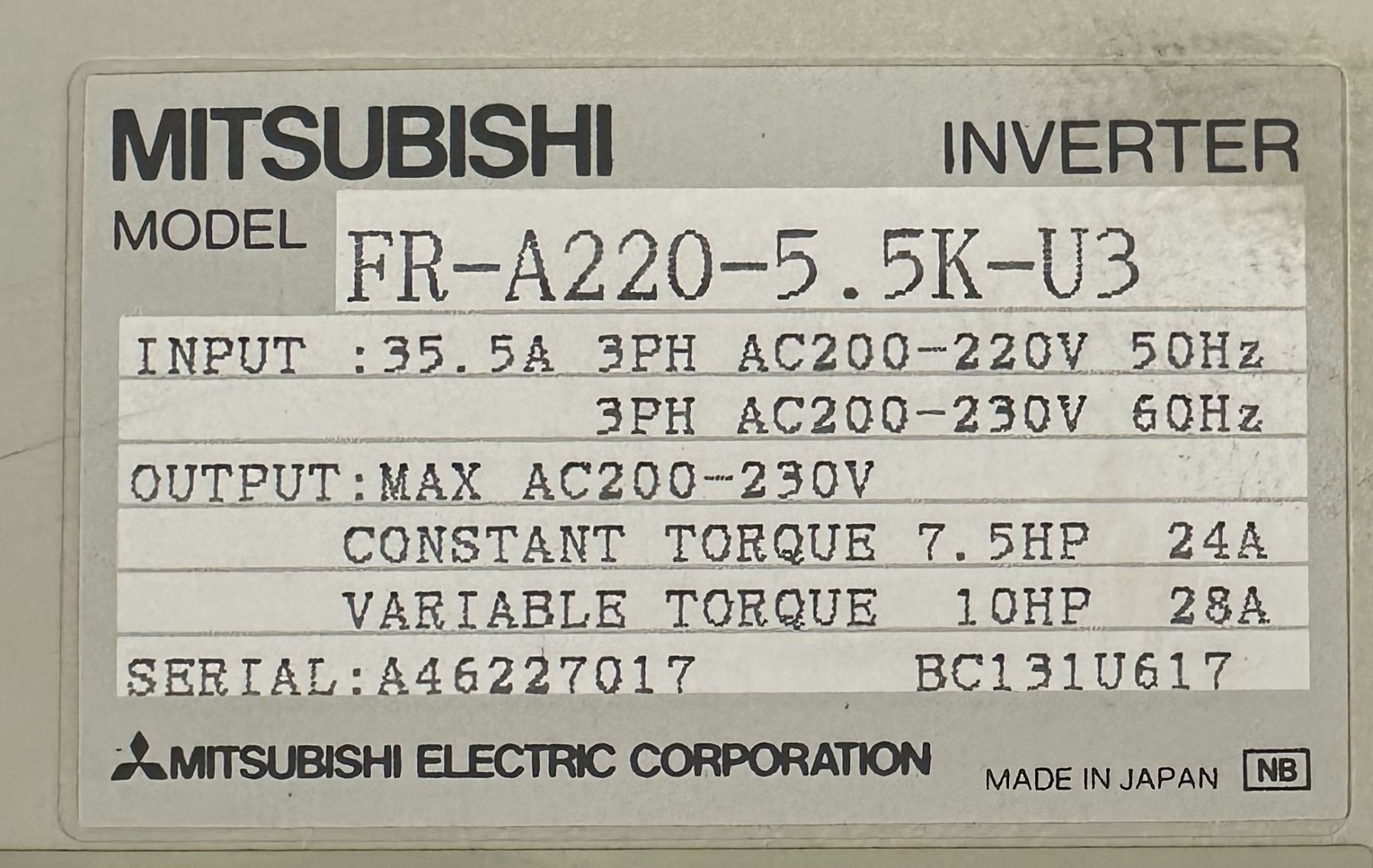 Mitsubishi #FR-A220-5.5K-U3 Inverter