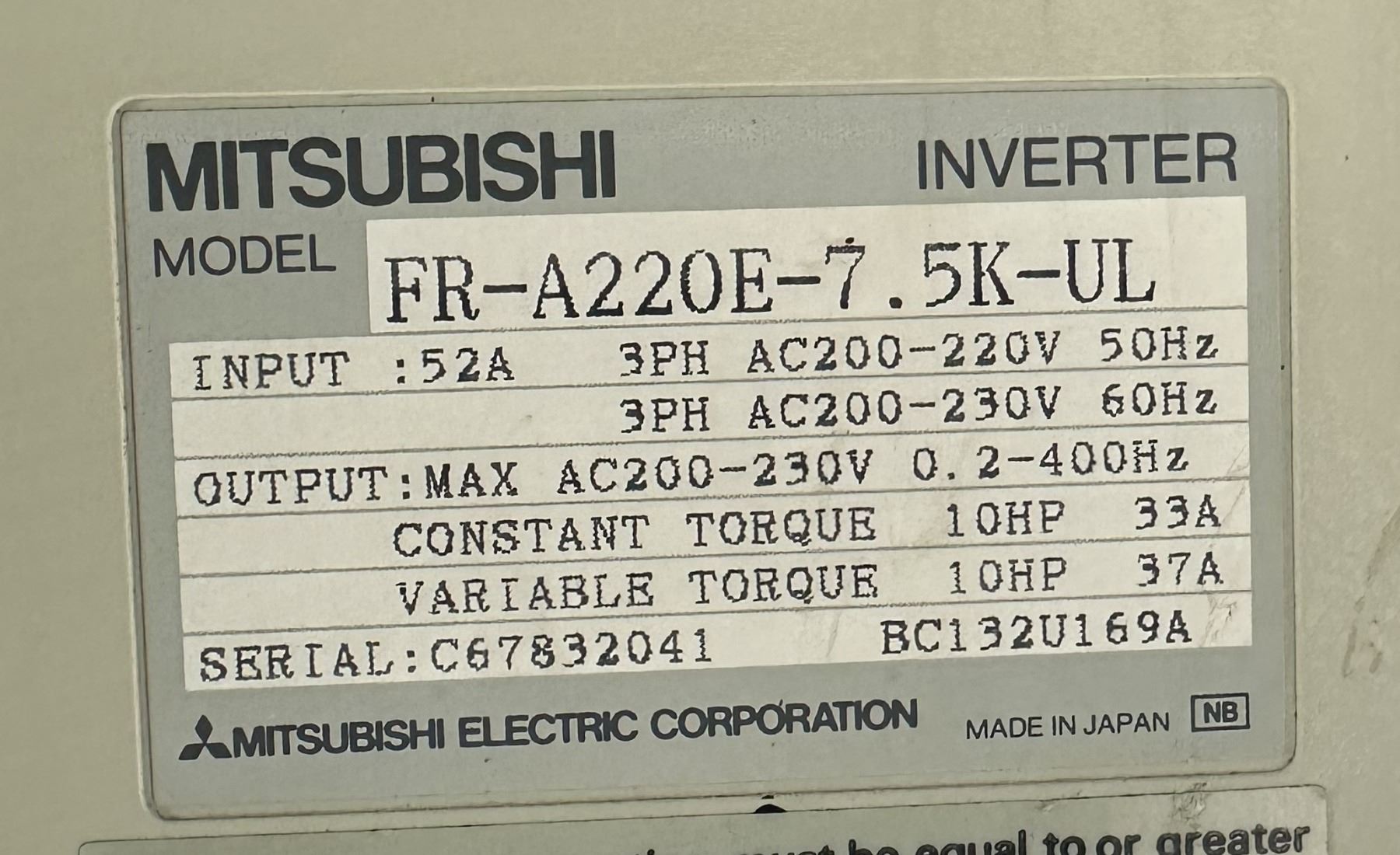 Mitsubishi #FR-A220E-7.5K-UL Inverter
