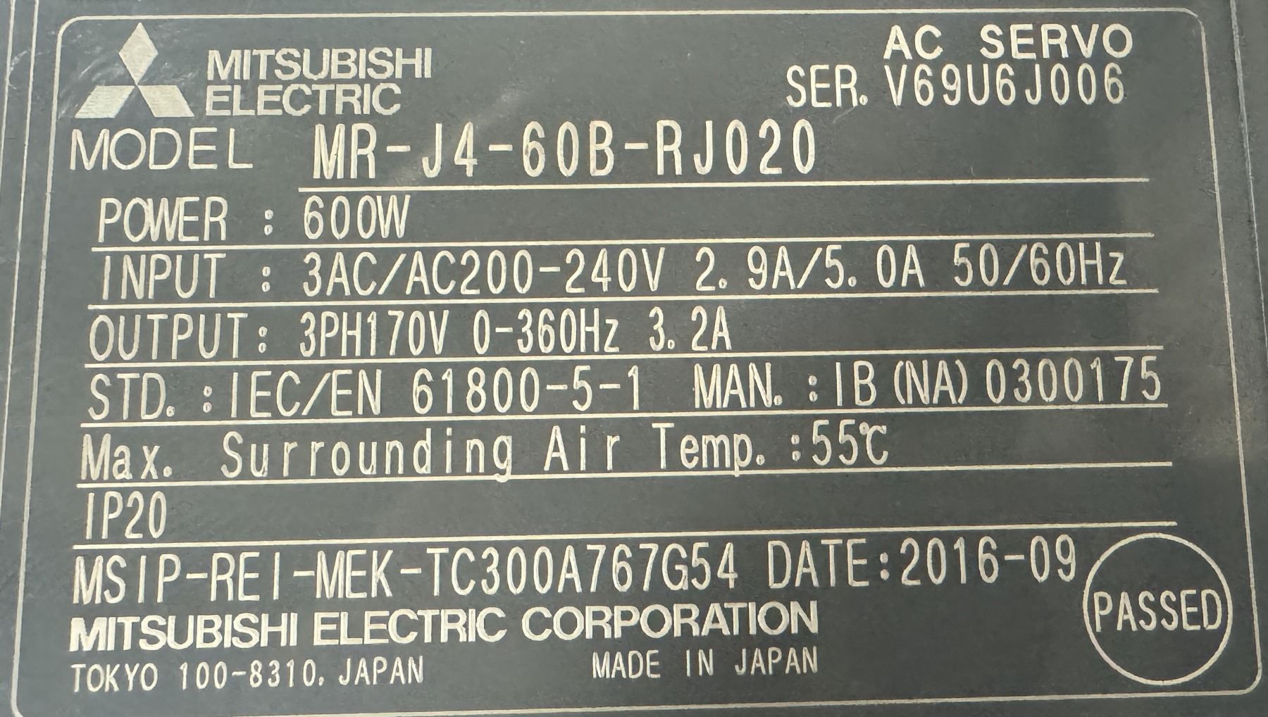 Mitsubishi #MR-J4-60B-RJ020 AC Servo Drive