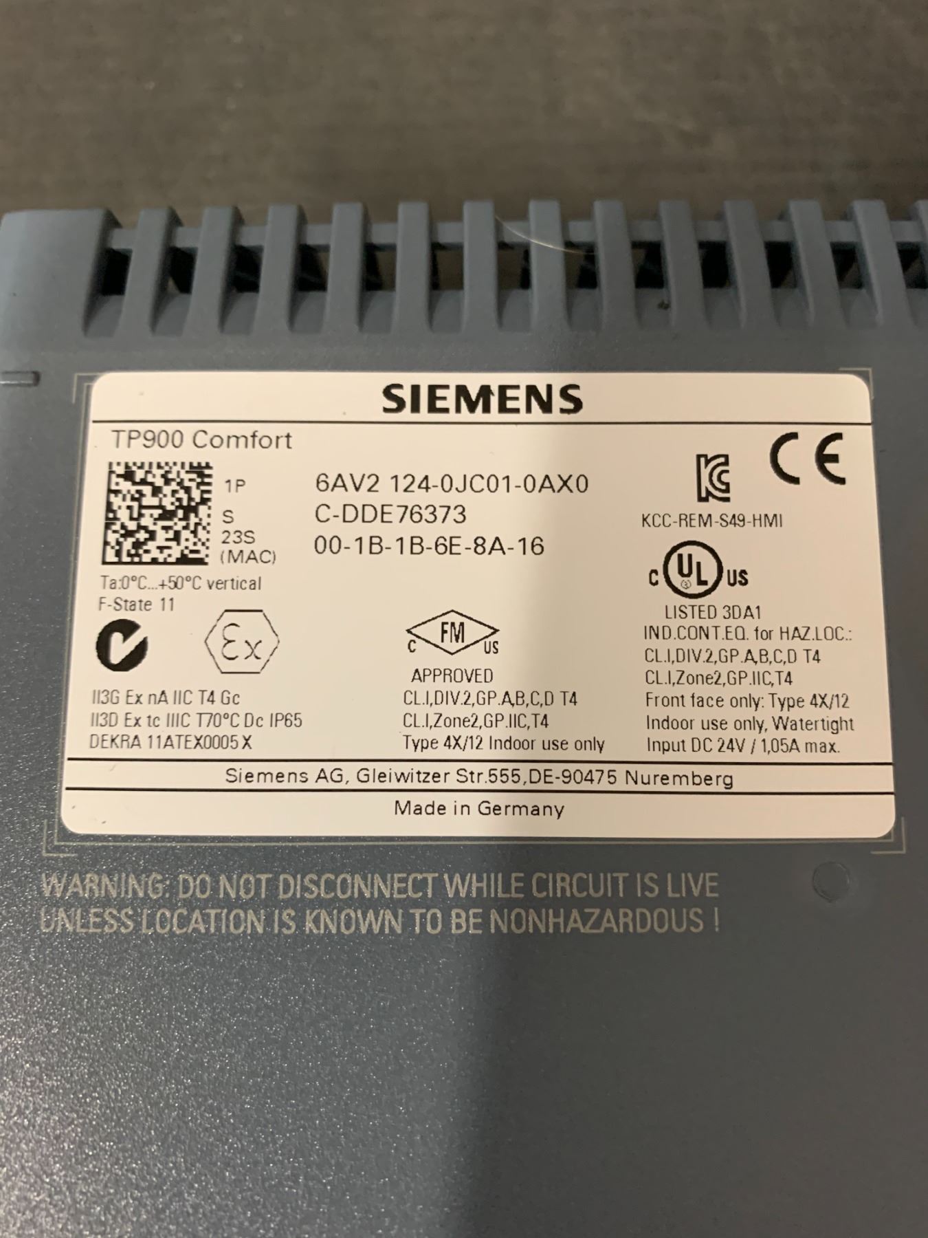 SIEMENS 6AV2 124-0JC01-0AX0 TP900 COMFORT TOUCH SCREEN