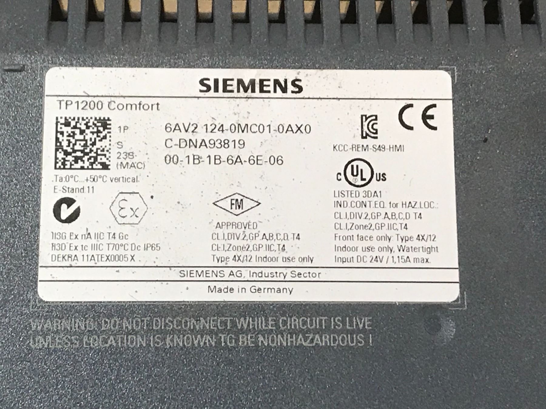 SIEMENS 6AV2 124-0MC01-0AX0 TP1200 COMFORT TOUCH PANEL